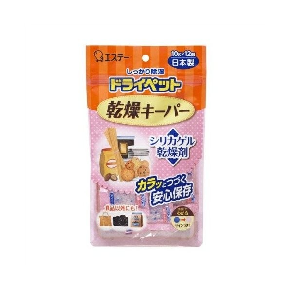 「ドライペット 乾燥キーパー 10g×12個」は、密閉保存容器に一緒に入れるだけで、乾燥状態をキープするシリカゲル(乾燥剤)です。使い終わりが分かりやすい、おとりかえサインつきです。食品まわりにも安心なシリカゲルを使用しています。