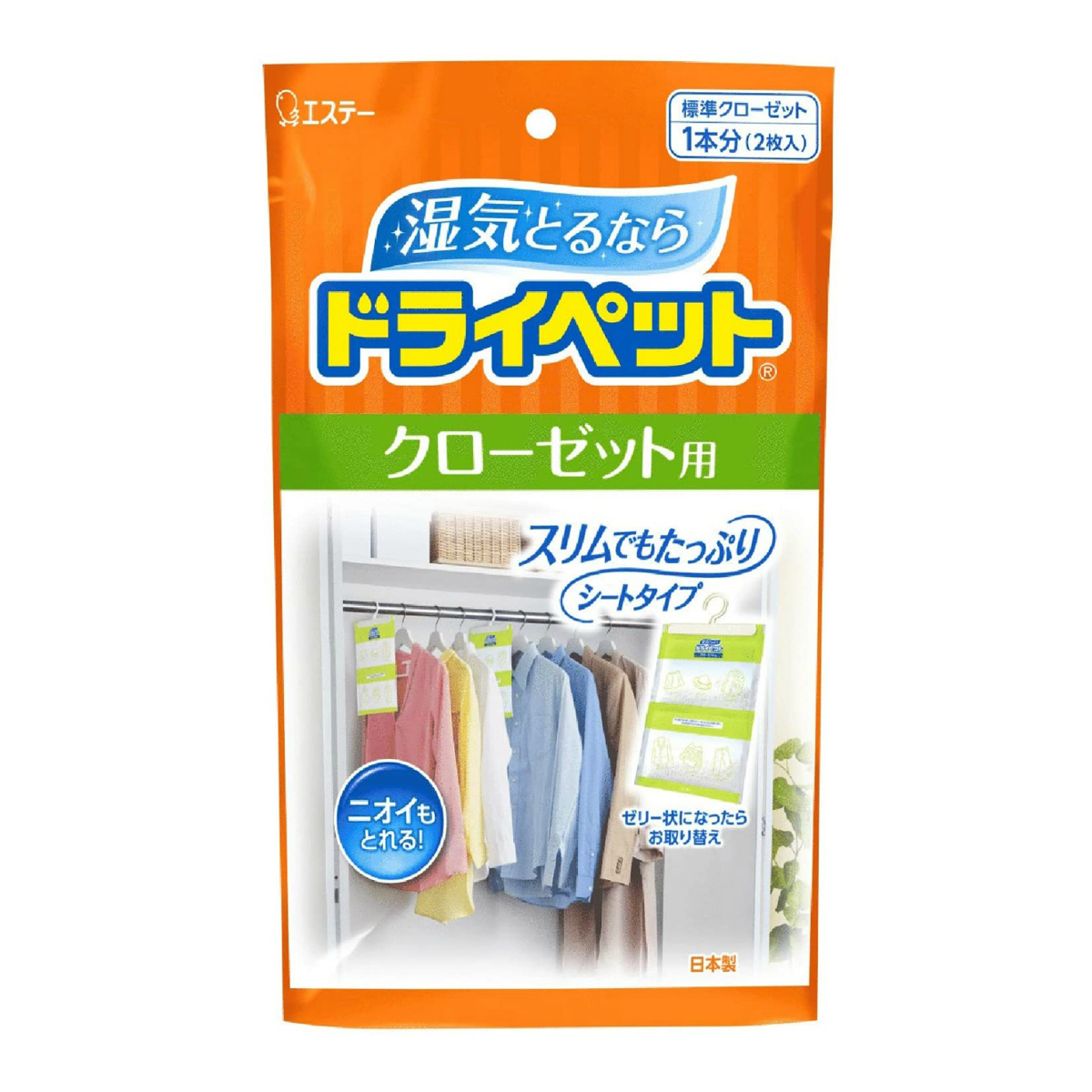 「ドライペット クローゼット用 120g×2個入」は、クローゼット内のに湿気を取り、こもったニオイも消臭する除湿剤です。薬剤がゼリー状になるので、除湿効果がひとめで分かります。うすデカシートの2枚入り。