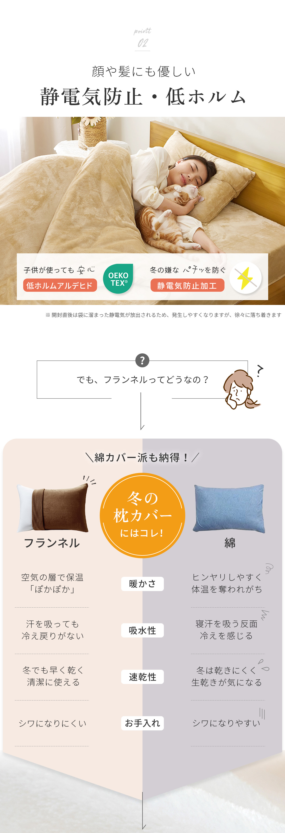 静電気防止加工は施しておりますが、袋に静電気溜まるため開封直後は放出されやすくなっています。徐々に落ち着きますが、直ぐにお使いになりたい場合は、使用前に柔軟剤等でお洗濯お願い致します。