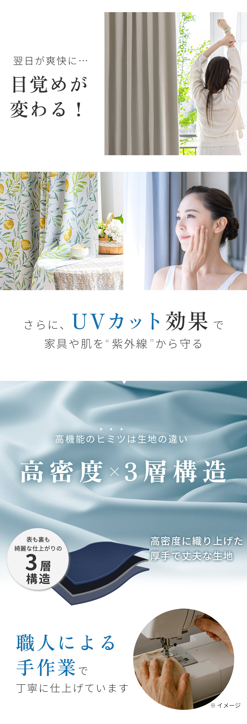厚みのある生地のため、ミシン目が薄手のカーテンより目立ちやすくなりますが不良ではございません。