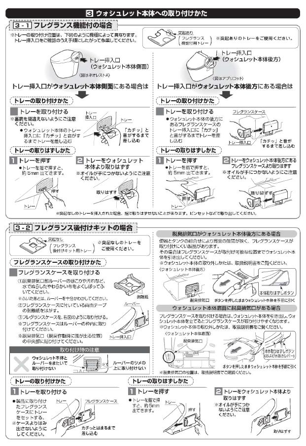 ■ 取り付け方法 ケースをウォシュレットの脱臭排気口にセットし、フレグランスを入れたトレーを差し込むだけ。