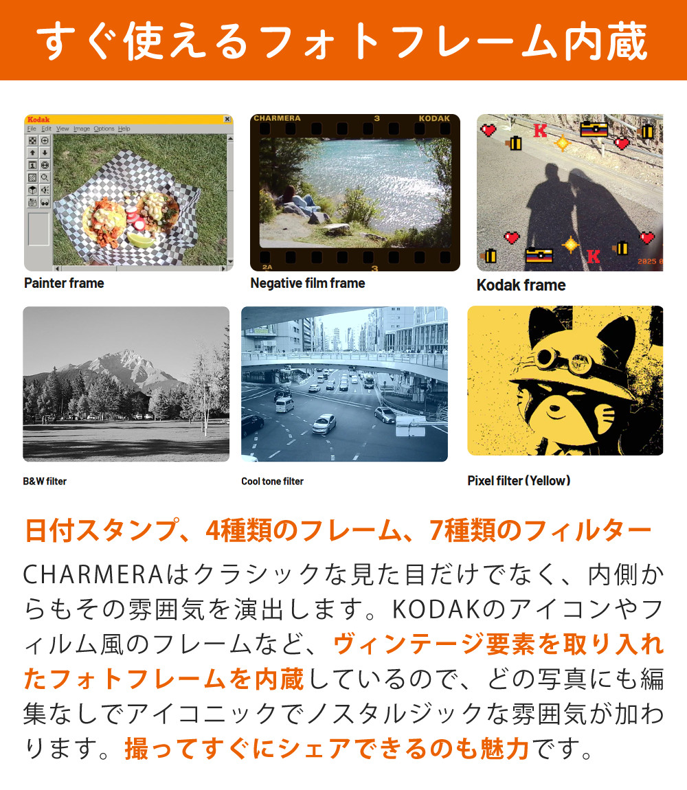 KODAKフレームとフィルターで“エモい”仕上がりCool Tone、Warm Tone、Black & White、Pixel Filter(Yellow/Red/Blue/Gray)などKODAK独自のフレーム&フィルターを搭載。撮影するだけでヴィンテージ感あふれる雰囲気に仕上がり、レトロデザインの良さがより際立ちます。