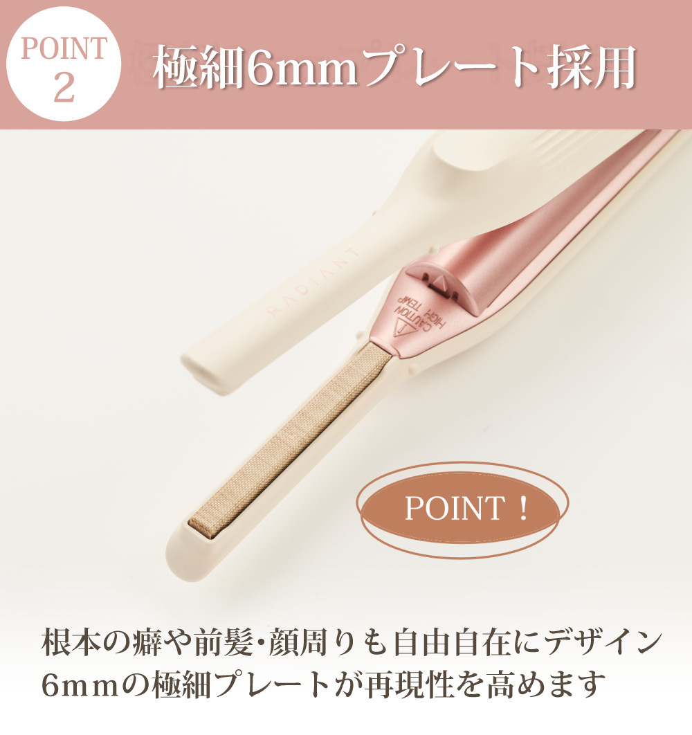 ●プレート幅6mmと極細プレートで根本の癖や前髪・顔周りなど細かなスタイリングも再現しやすく、自由自在にスタイリング