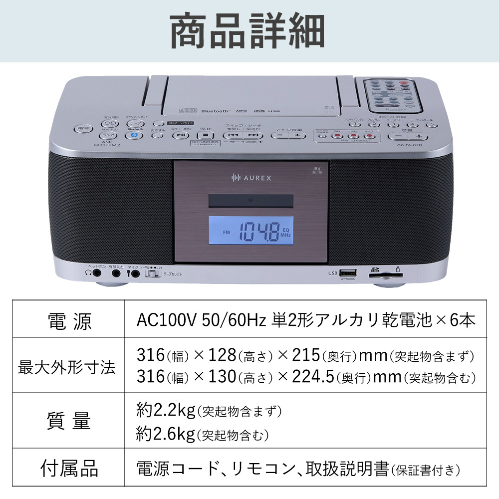 | 電池持続時間 | 東芝単2形アルカリ乾電池使用時 CD/Bluetooth(TM)再生時:約9時間 ラジオ受信時:約12時間 テープ再生時:約9時間 SD再生時:約11時間 USB再生時:約10時間 | |