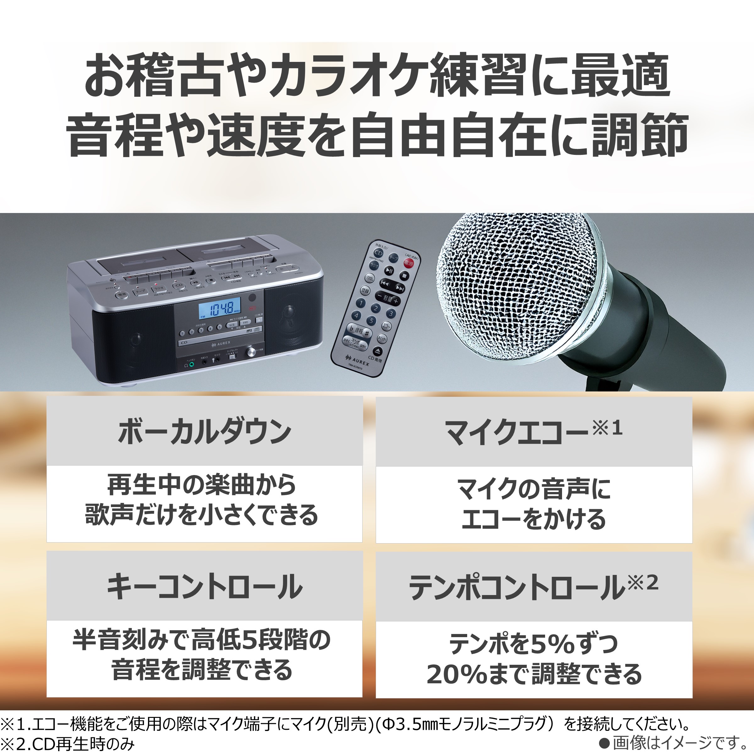 従来機能である「ボーカルダウン」「マイクエコー」ボタン、「キーコントロール機能」に加え、「テンポコントロール」が追加。