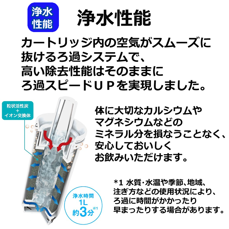 ・カートリッジ内の空気がスムーズに抜けるろ過システムで、高い除去性能はそのままにろ過スピードUPを実現しました。