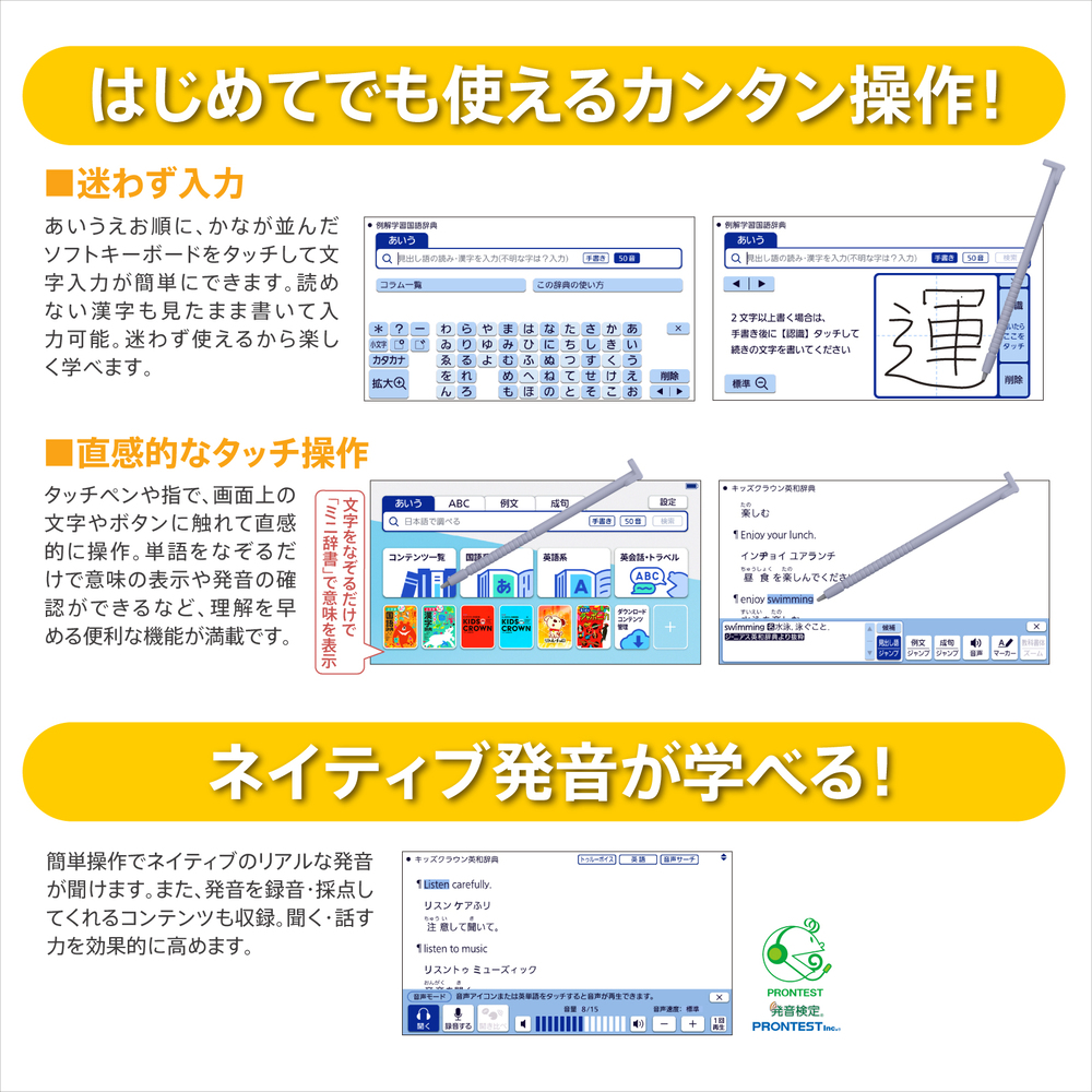 小学生の学習をしっかりサポートできる辞書や百科事典などを収録。読み仮名つきで読みやすい辞書や、イラストやアニメで楽しみながら学べるコンテンツなど小学生の学習レベルに合ったコンテンツが豊富でお子様の学習意欲を育てます。
