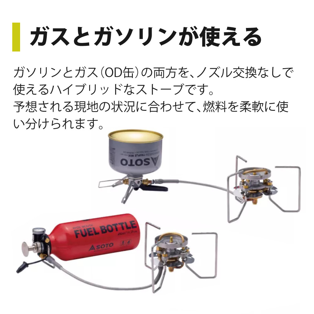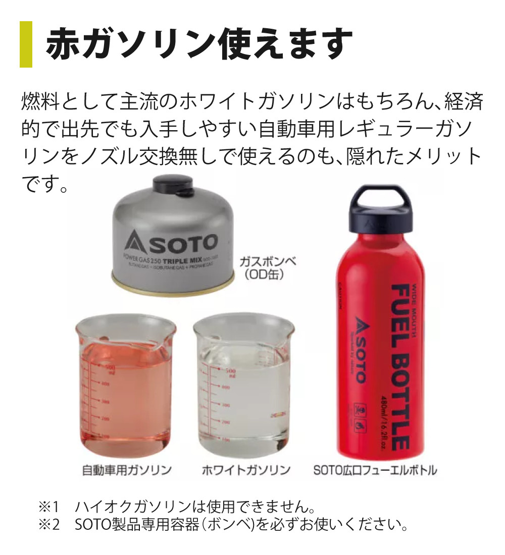 | 使用燃料 | SOTO製品専用容器(ボンベ) 自動車用レギュラーガソリン、ホワイトガソリン |