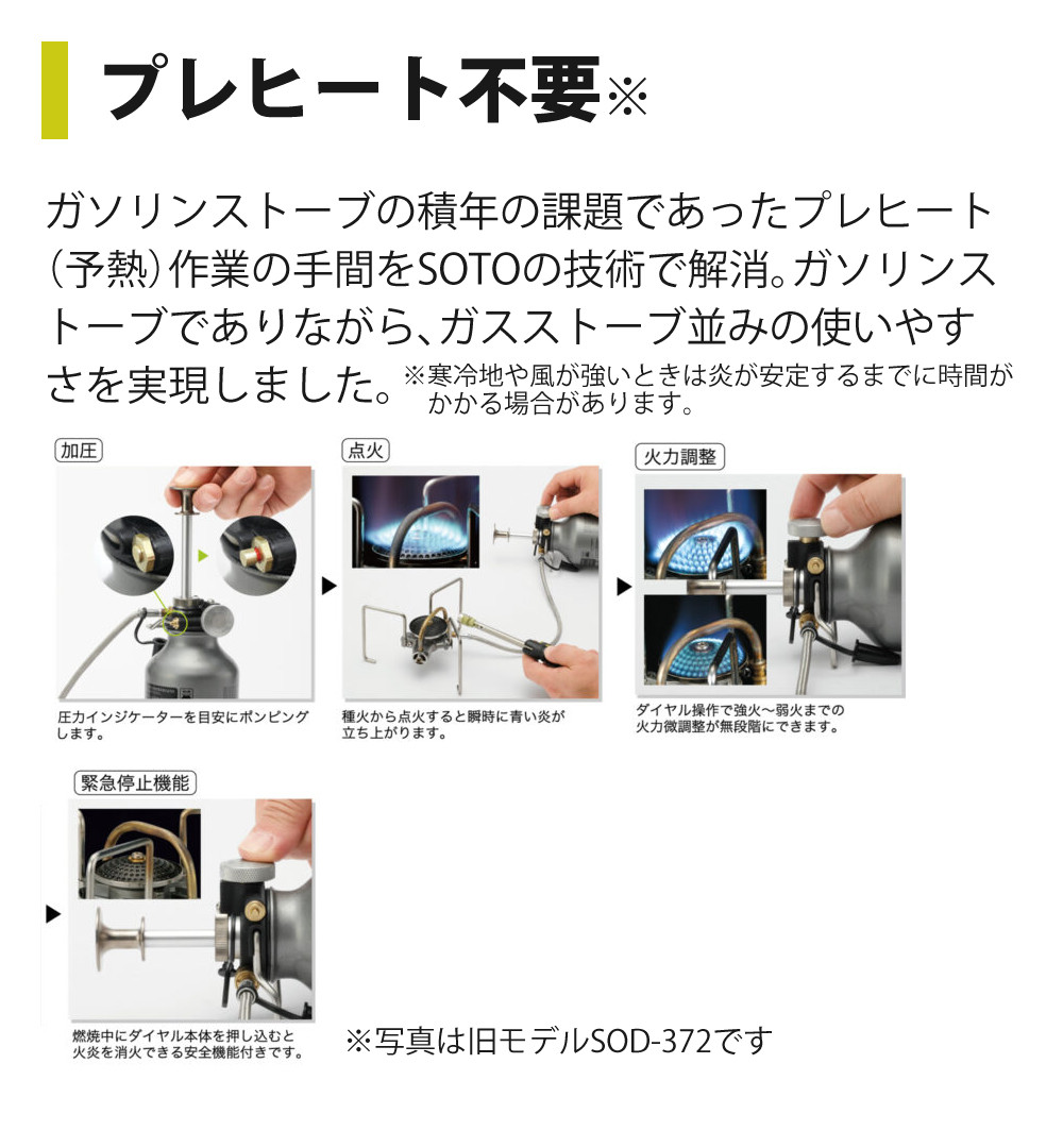 ガソリンストーブの積年の課題であったプレヒート(予熱)作業の手間をSOTOの技術で解消。ガソリンストーブでありながら、ガスストーブ並みの使いやすさを実現しました。