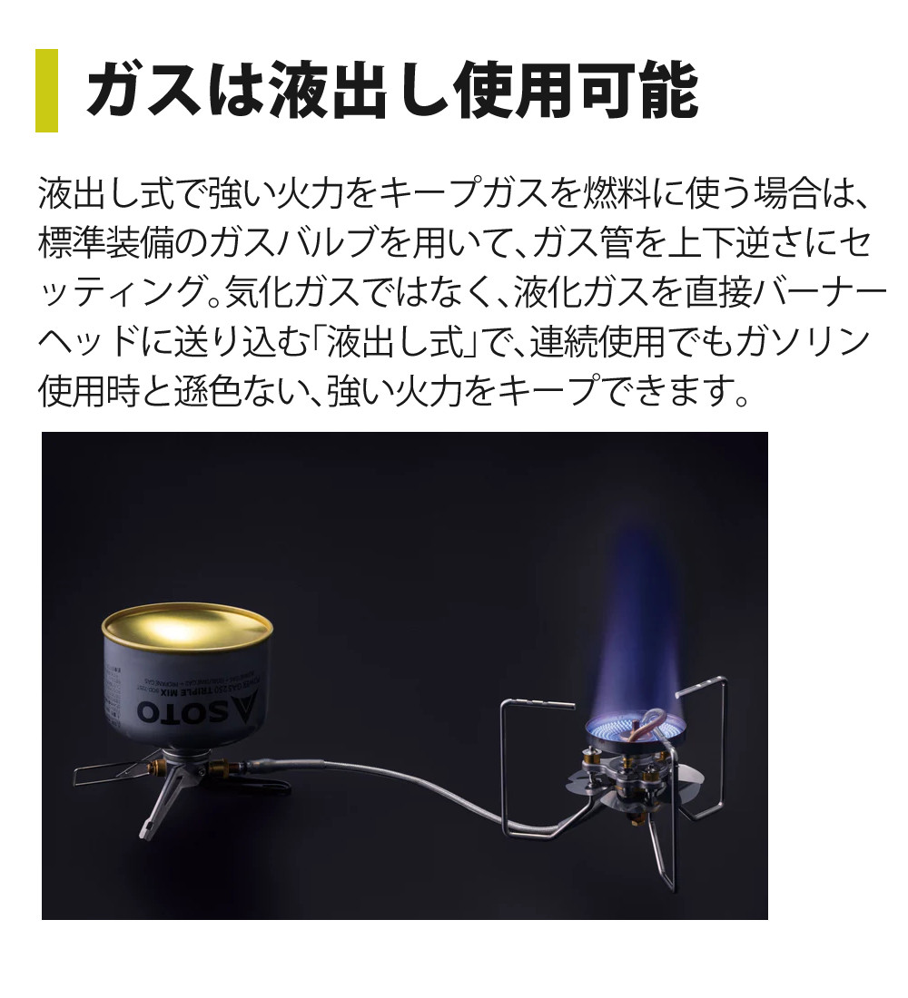 液出し式で強い火力をキープ。ガスを燃料に使う場合は、標準装備のガスバルブを用いて、ガス管を上下逆さにセッティング。気化ガスではなく、液化ガスを直接バーナーヘッドに送り込む「液出し式」で、連続使用でもガソリン使用時と遜色ない、強い火力をキープできます。