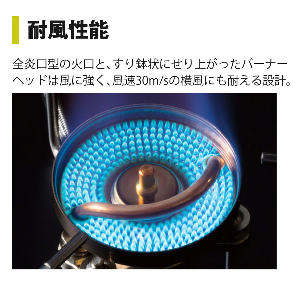 バーナーヘッドに広がる炎口の数は約300個。この圧倒的な数により火足の短い炎を実現。全炎口型の火口とすり鉢状のバーナーヘッドの効果で優れた耐風性を実現。強風時にも炎の中心がほとんど流されず、短時間で水を沸騰させることができます。また無駄なガスの消費を抑えることができます。