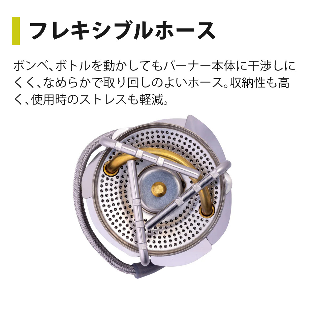 ボンベ、ボトルを動かしてもバーナー本体に干渉しにくく、なめらかで取り回しのよいホース。収納性も高く、使用時のストレスも軽減。