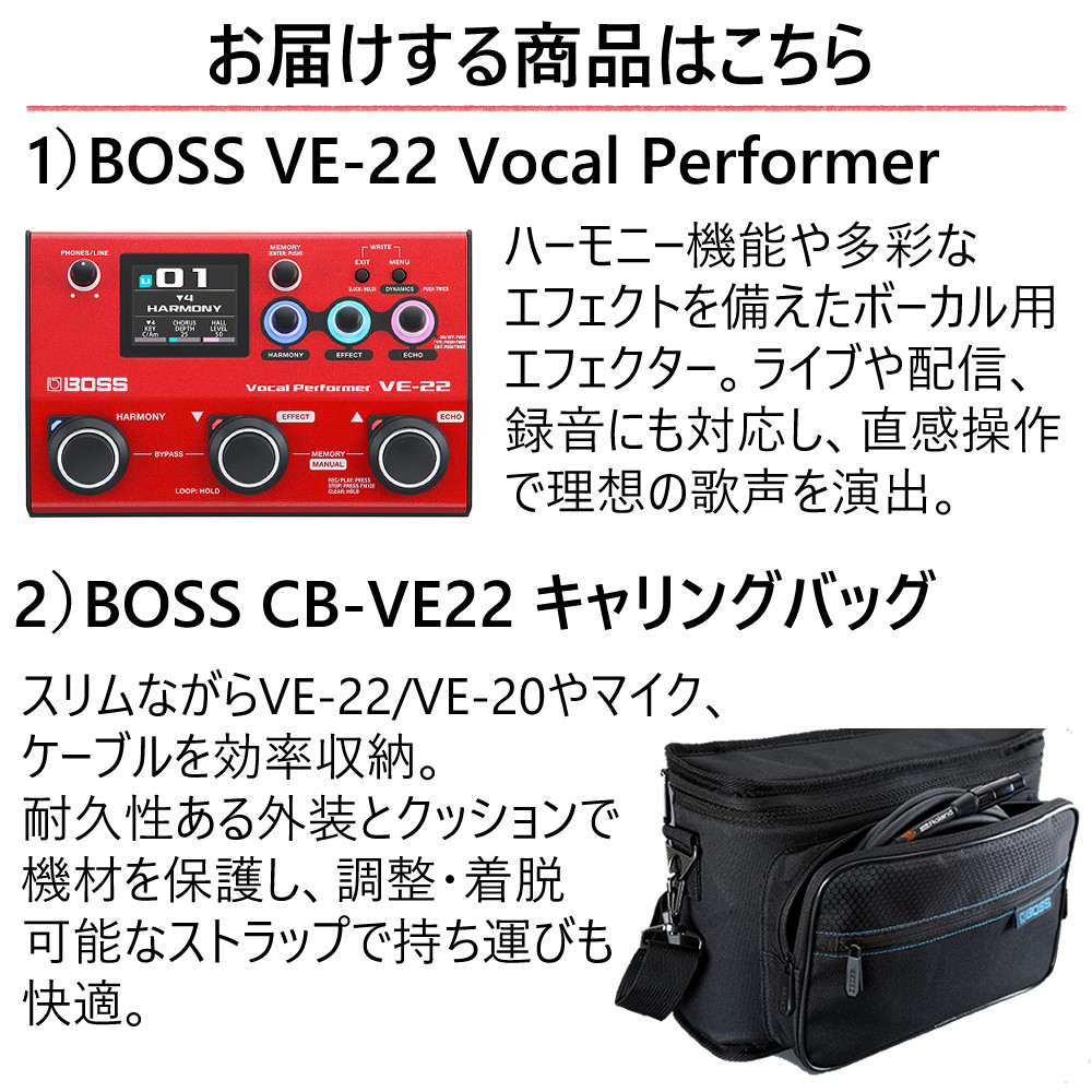 | 1)BOSS VE-22 Vocal Performer ボーカルエフェクター 【メーカー保証】1年間 【付属品】スタートアップ・ガイド、アルカリ電池(単三形)×4、「安全上のご注意」、チラシ |