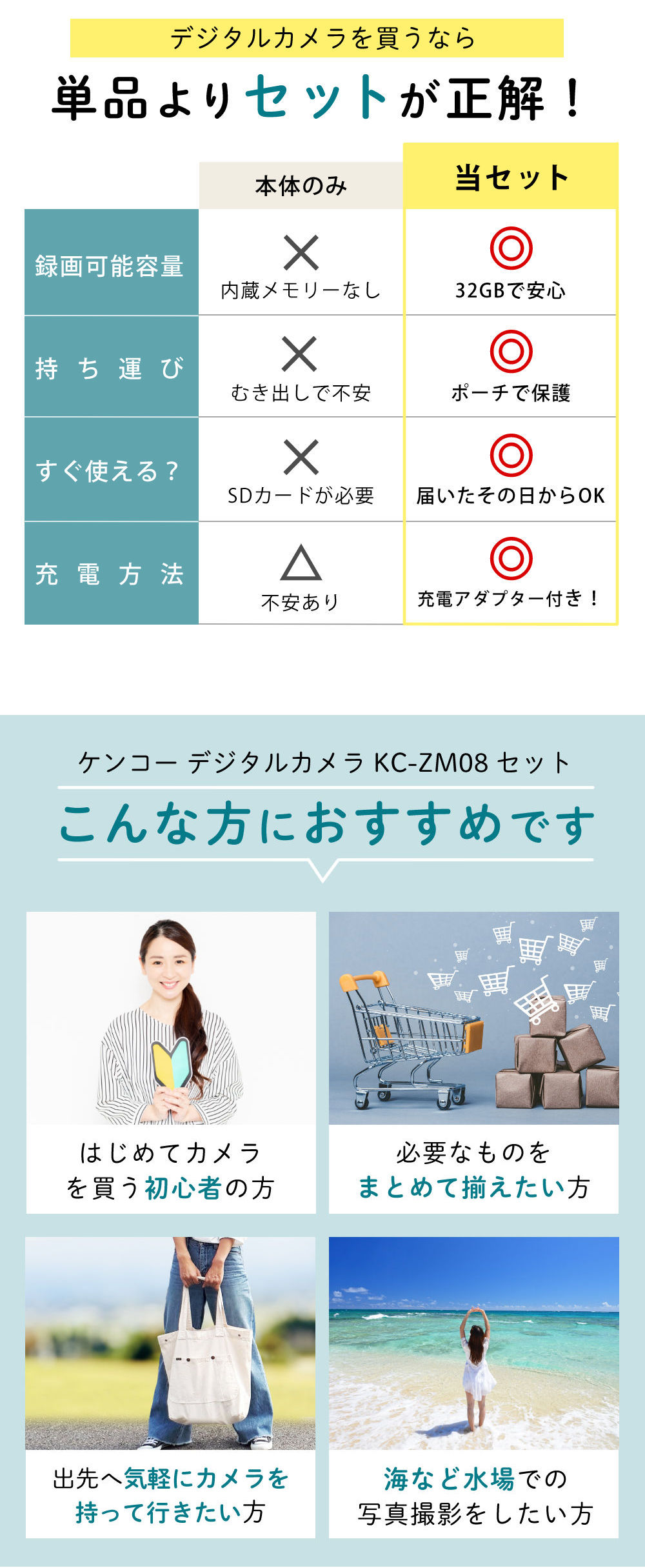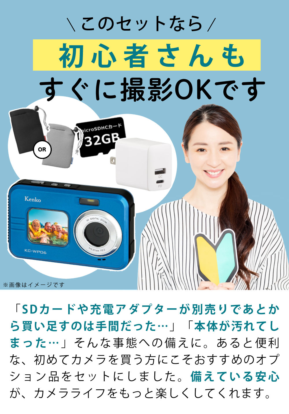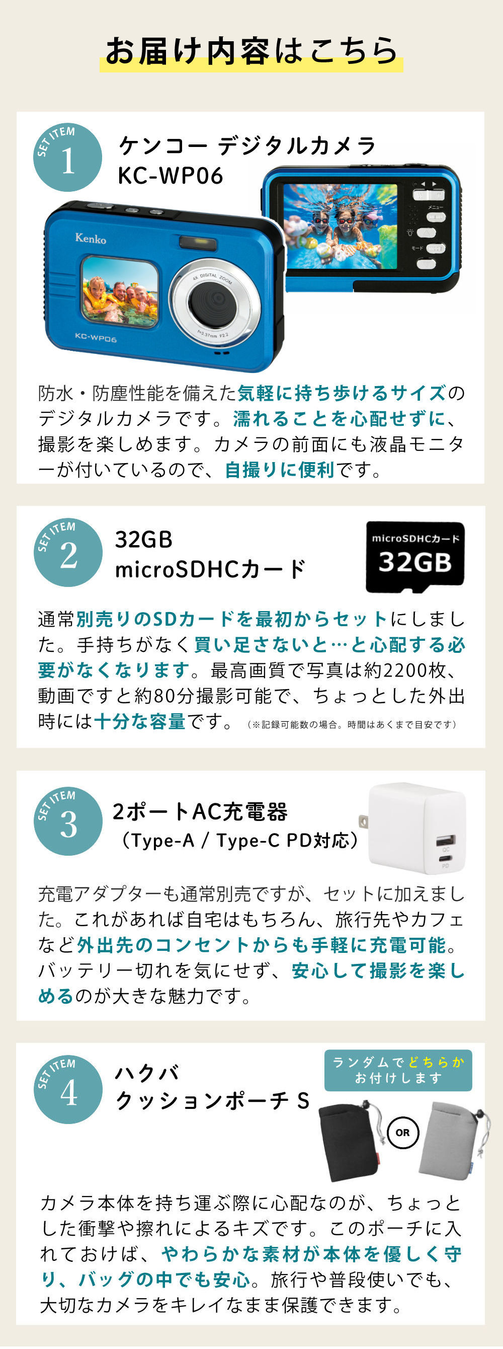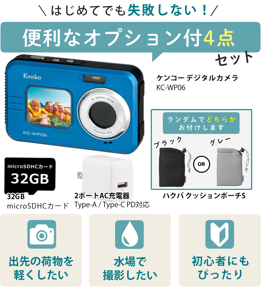 | 1)ケンコー 防水デジタルカメラ KC-WP06 【メーカー保証】1年間 【生産国】中国 【付属品】リチウムイオン充電池、ストラップ、USBケーブル(Type-A to microUSB)、取扱説明書 |