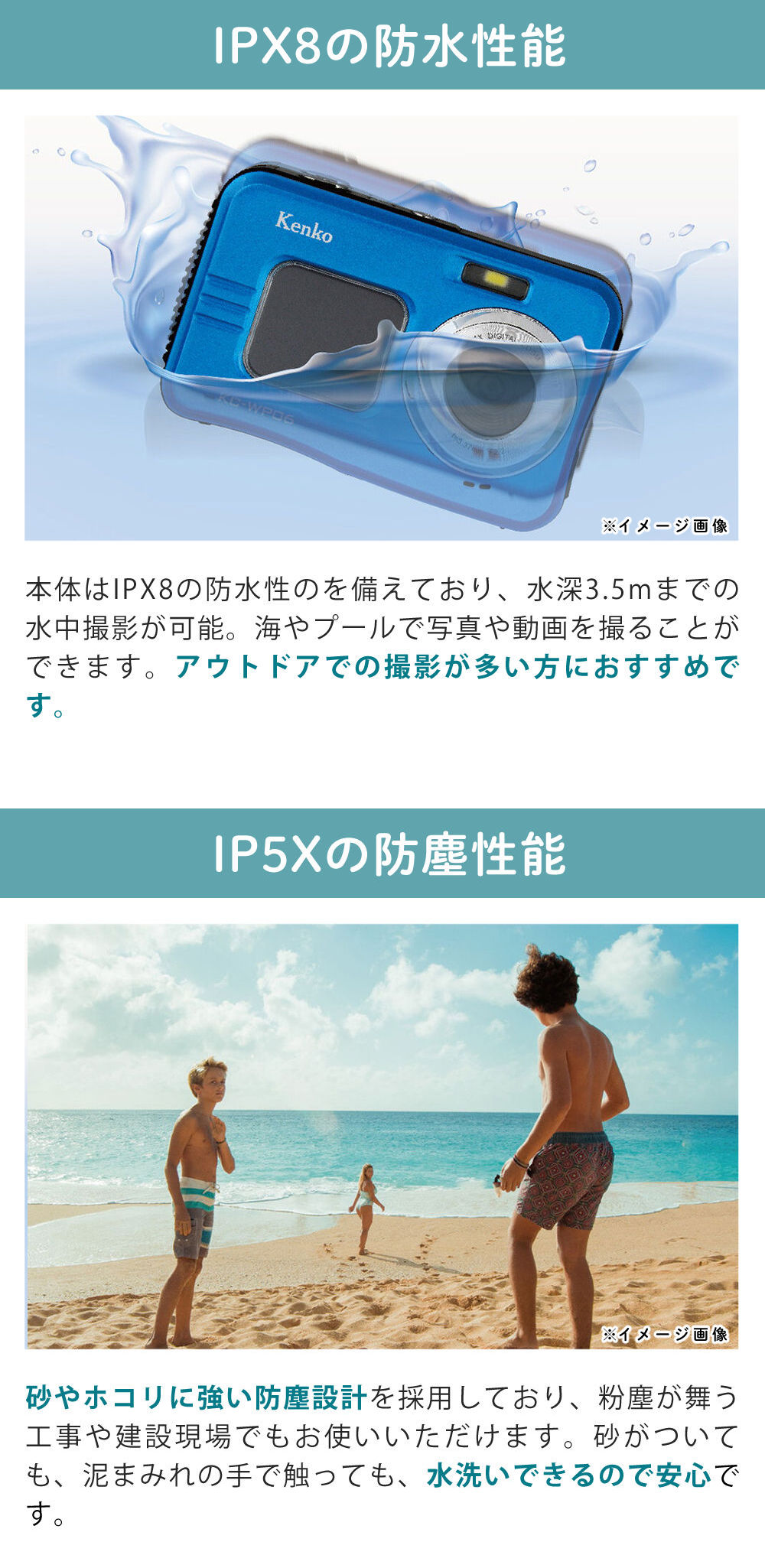 水深3.5mまで対応するIPX8の防水性能と、IP5Xの防塵性能を備えたコンパクトデジタルカメラです。