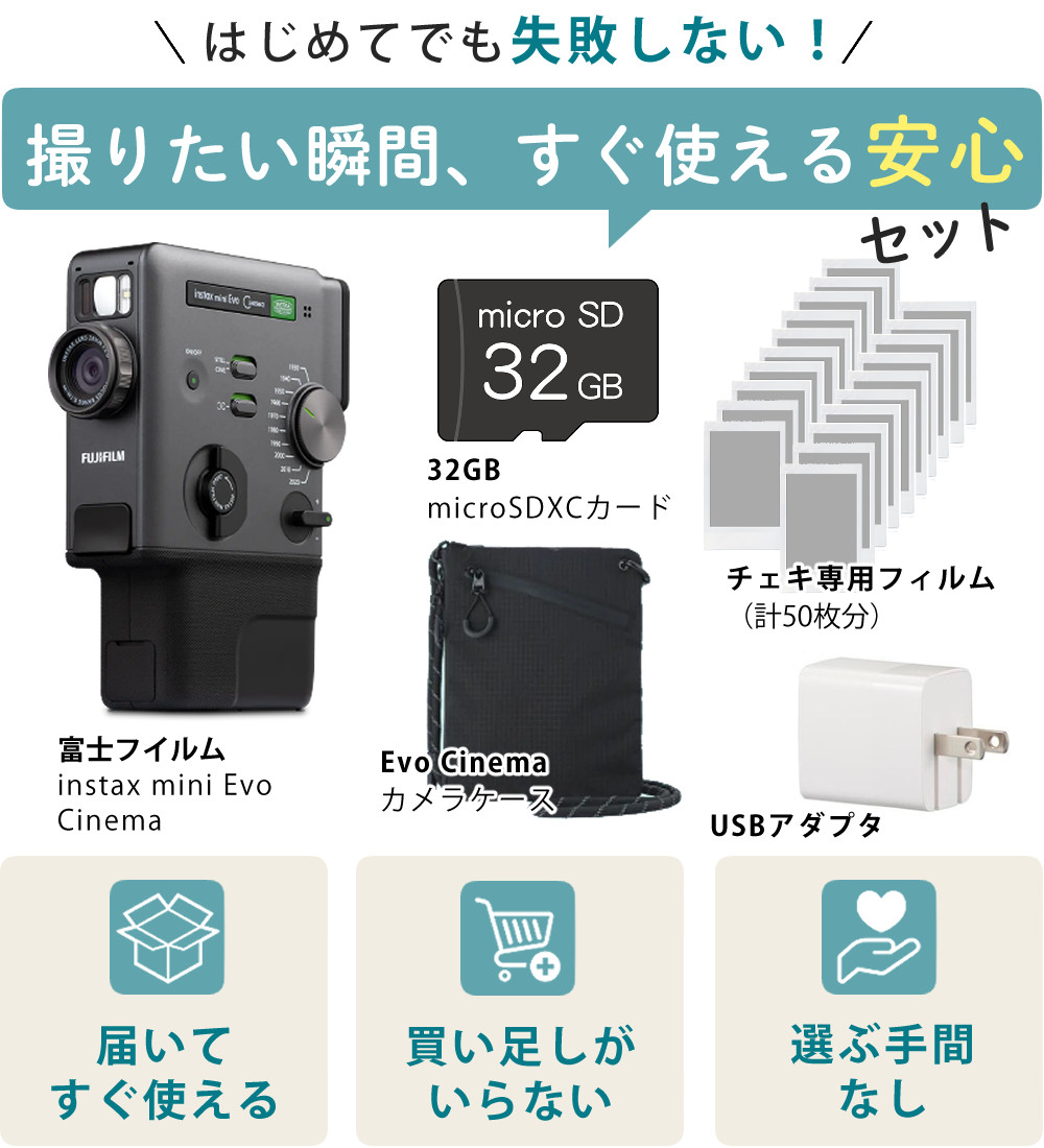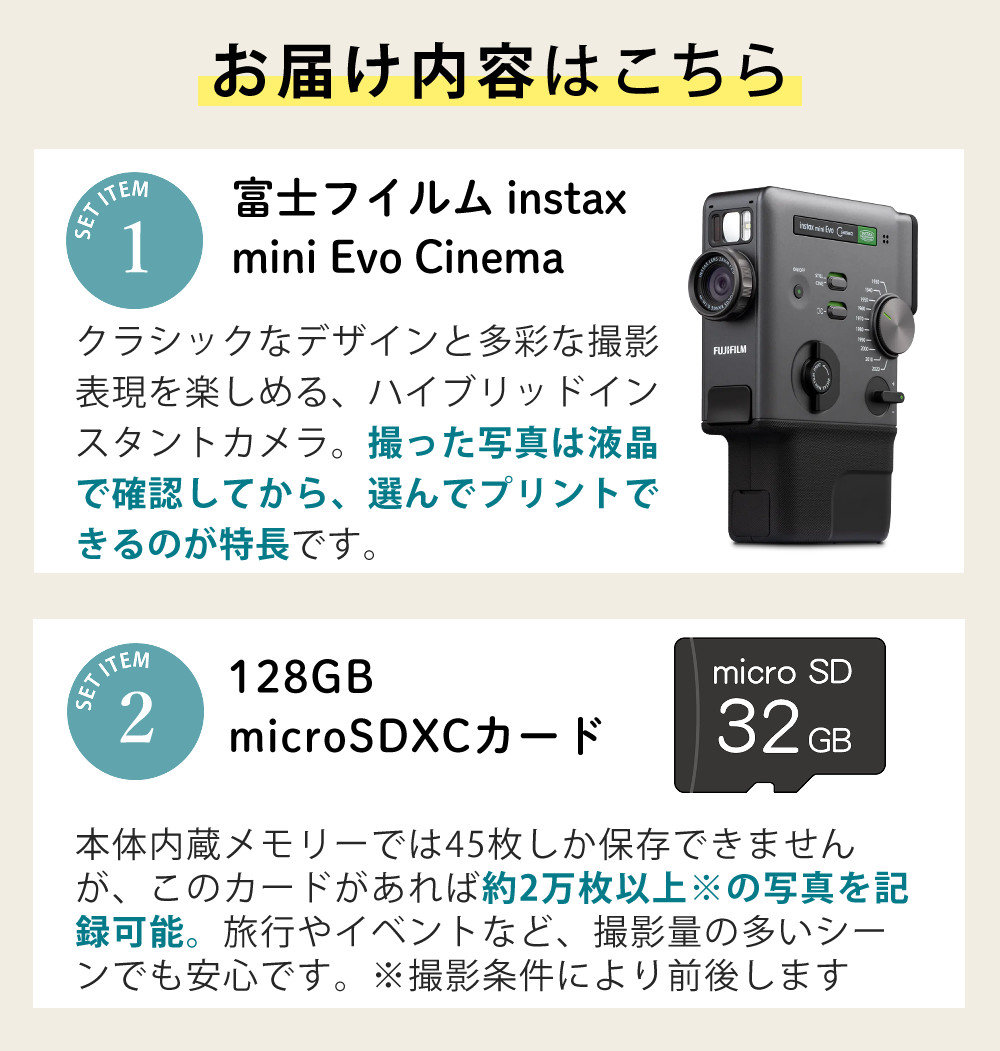 | 1)富士フイルム INS MINI EVO CINEMA チェキカメラ (16956017) 【メーカー保証】1年間 【付属品】ファインダーアタッチメント[ストラップ付き] ハンドストラップ USB Type-Cケーブル 使用説明書 グリップアタッチメント |