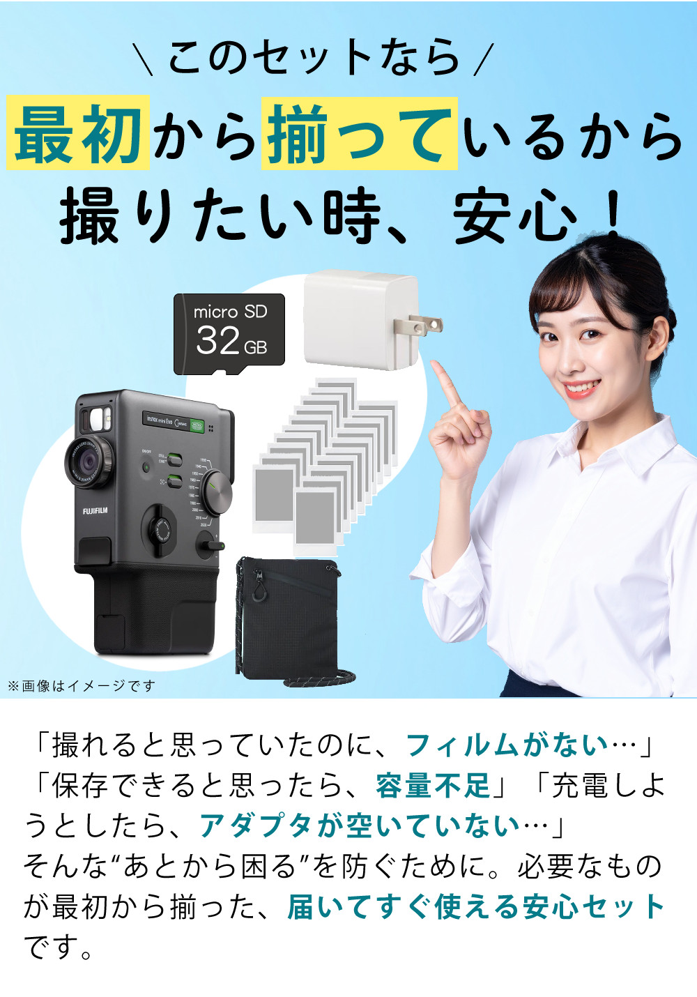 持ち運びに便利なカメラバッグやストラップ、チェキ アルバムにも対応。
