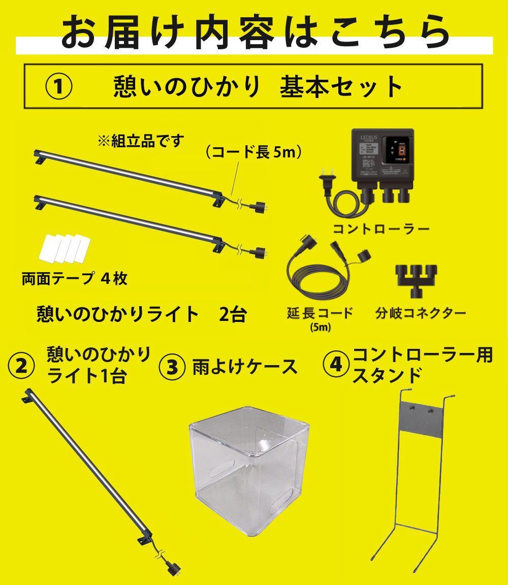 | 1)ひかりノベーション 憩いのひかり 基本セット /A 【メーカー保証】1年 【付属品】憩いのひかり 2台(コード長5m)、 両面テープ 4枚、コントローラー、 延長コード(5m)、分岐コネクター |