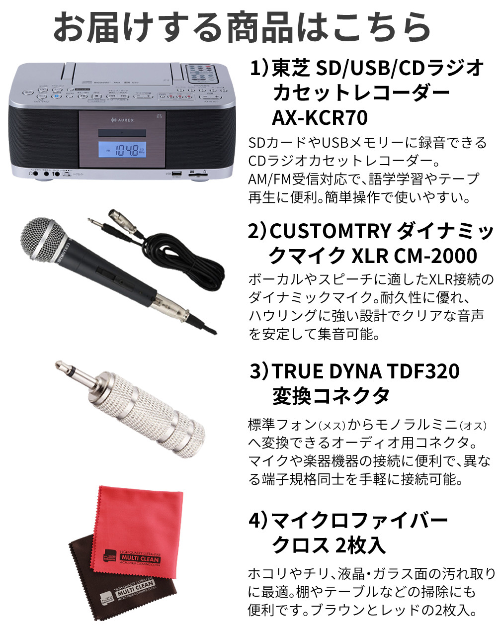 | 1)東芝 SD/USB/CDラジオカセットレコーダー AX-KCR70 【メーカー保証】1年間 【付属品】電源コード、リモコン、取扱説明書(保証書付き) |