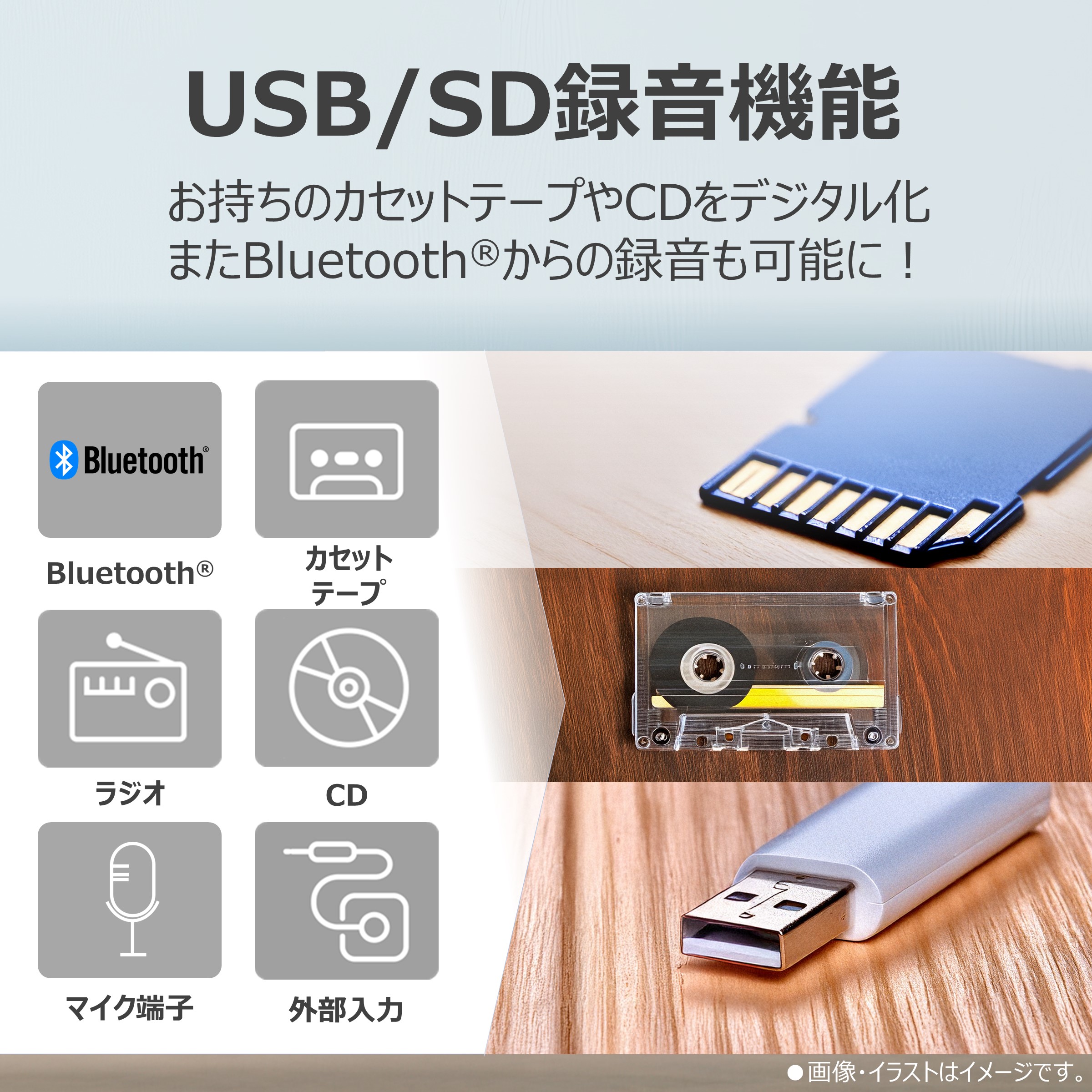 また、スマートフォンや音楽プレーヤーなどの音源もBluetooth(TM)やUSBに簡単に録音ができます。