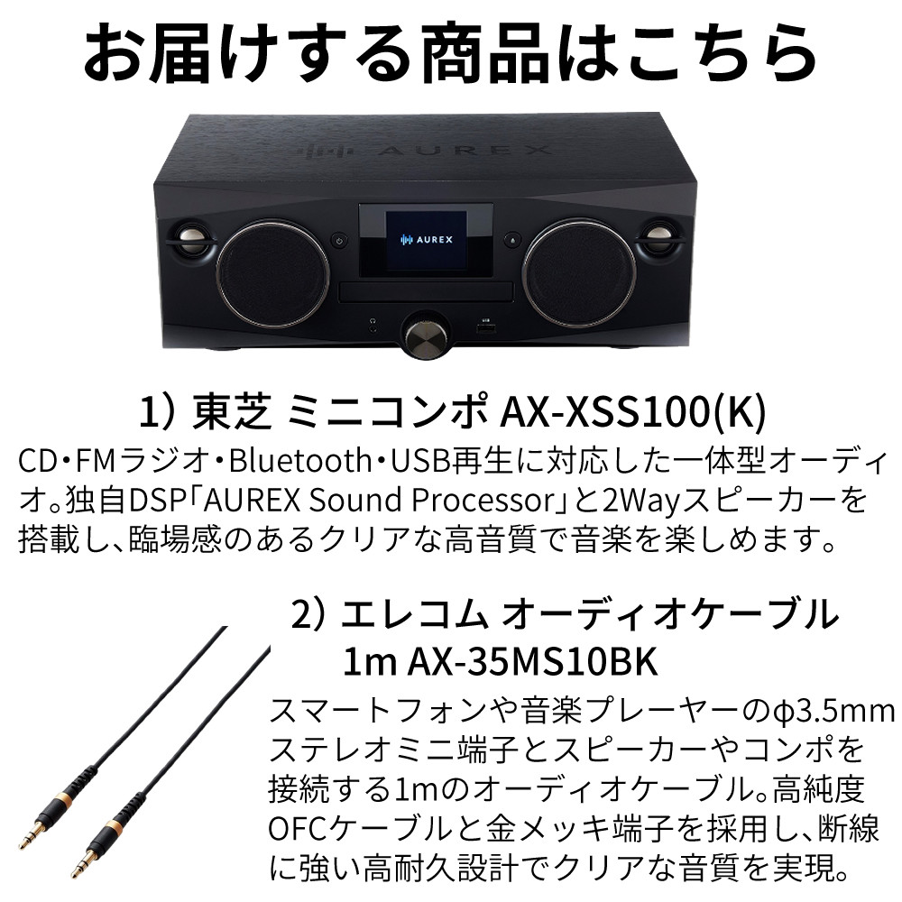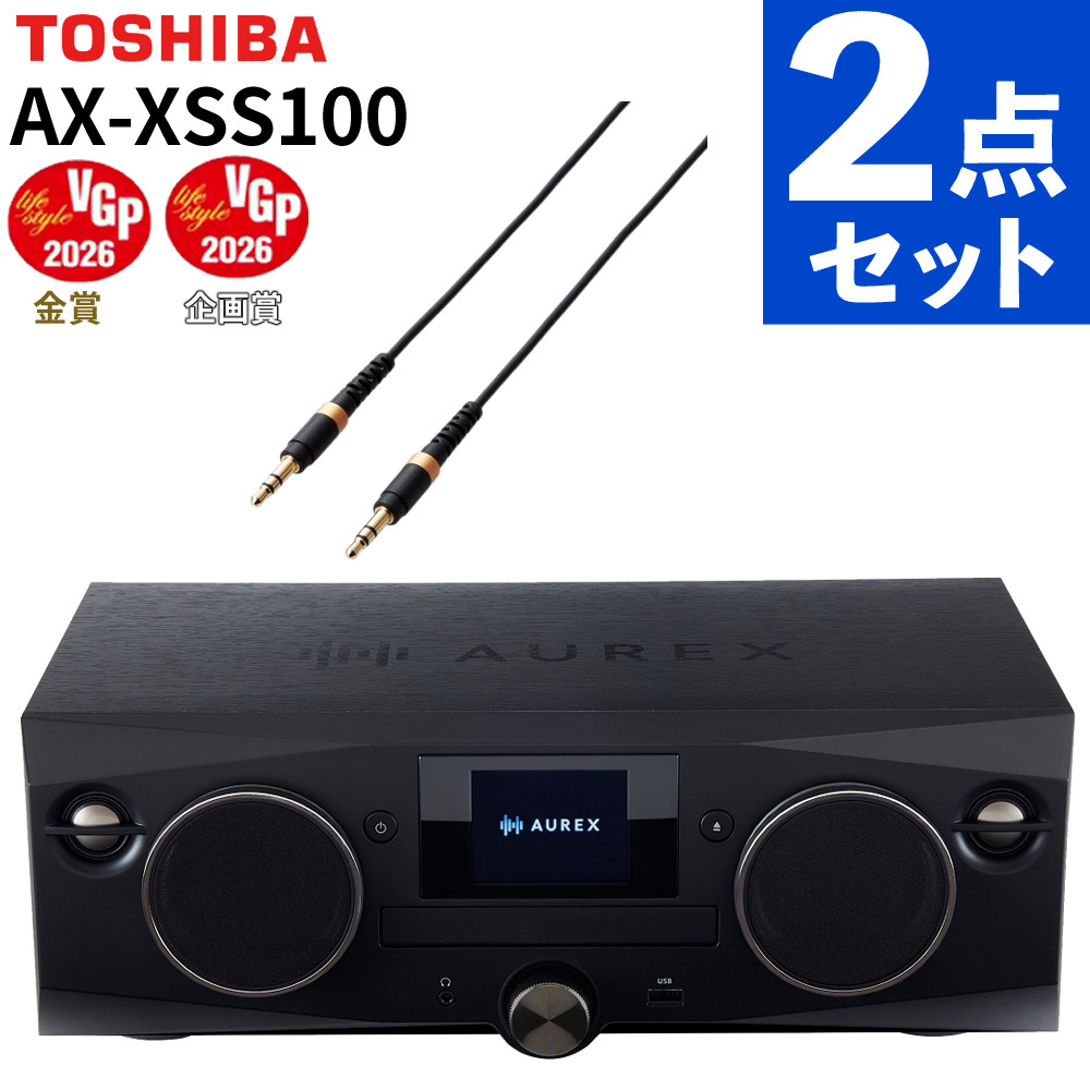 東芝 ミニコンポ AUREX AX-XSS100(K) ブラック は、CD・USB・Bluetooth・ワイドFMラジオ に対応した 一体型 の ハイレゾ対応 ミニコンポ です。独自の AUREX Sound Processor 搭載 で 音源を 192kHz/24bit 相当に アップコンバート し、ツイーターとウーファー による 2Way スピーカー で 豊かな 音場を 再現。リモコン や スリープタイマー、外部入力 も 備え、リビング や 寝室 で 快適 に 音楽 を 楽しめる コンポ です。
