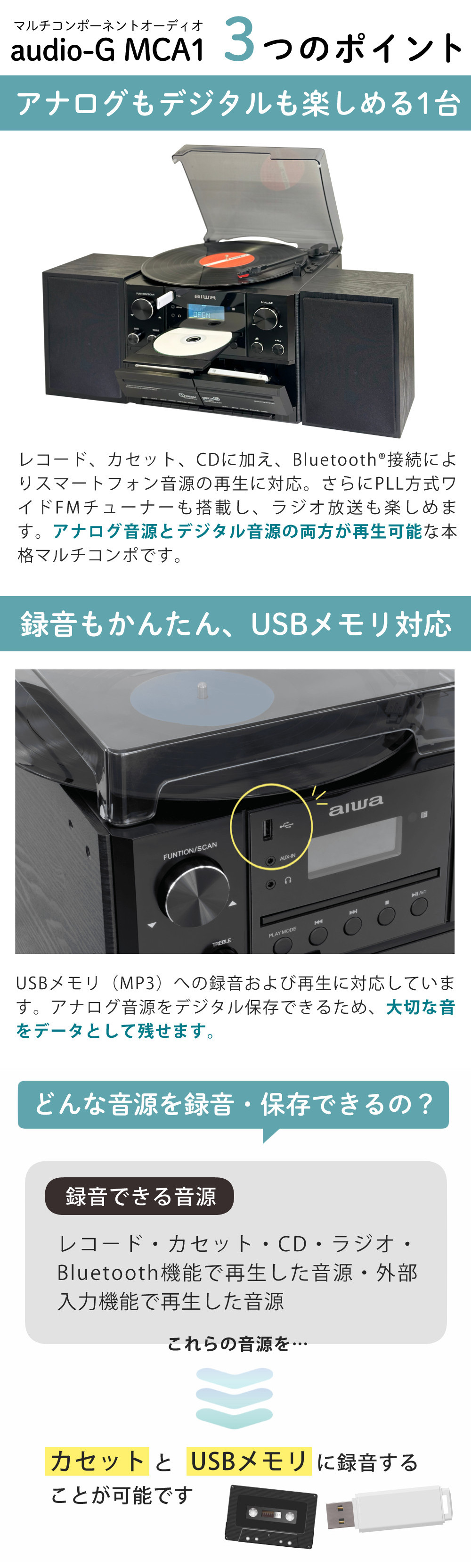 カセットへのアナログ録音と合わせてUSBへのデジタル録音ができます。