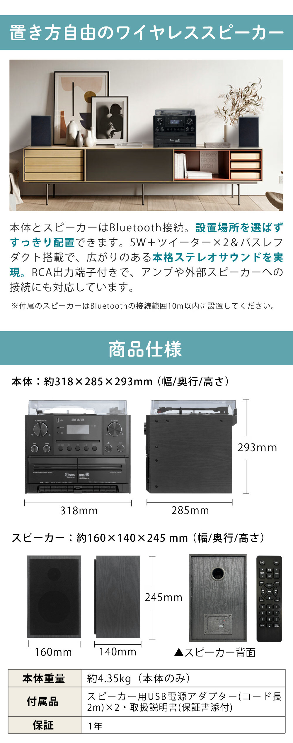 ●Bluetooth送信機能により本体とスピーカーは無線接続。コンセントさえあればスピーカーのレイアウトも自由自在。