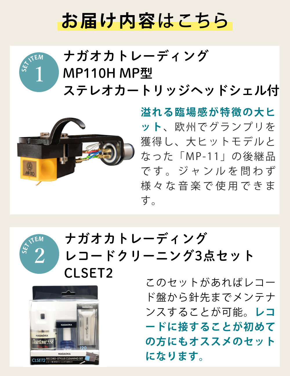 検索ワード:NAGAOKA ナガオカ ナガオカトレーディング MP型 ヘッドシェル付き ステレオカートリッジ MP110H レコード クリーニング3点セット