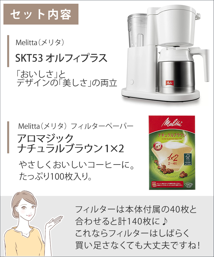 | ▼メリタ コーヒーメーカー オルフィプラス SKT53 【メーカー保証】1年間 【付属品】フィルターペーパー40枚、メジャースプーンx1、取扱説明書 【生産国】中国 |