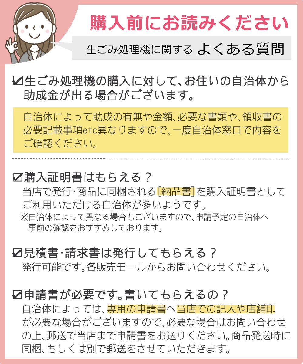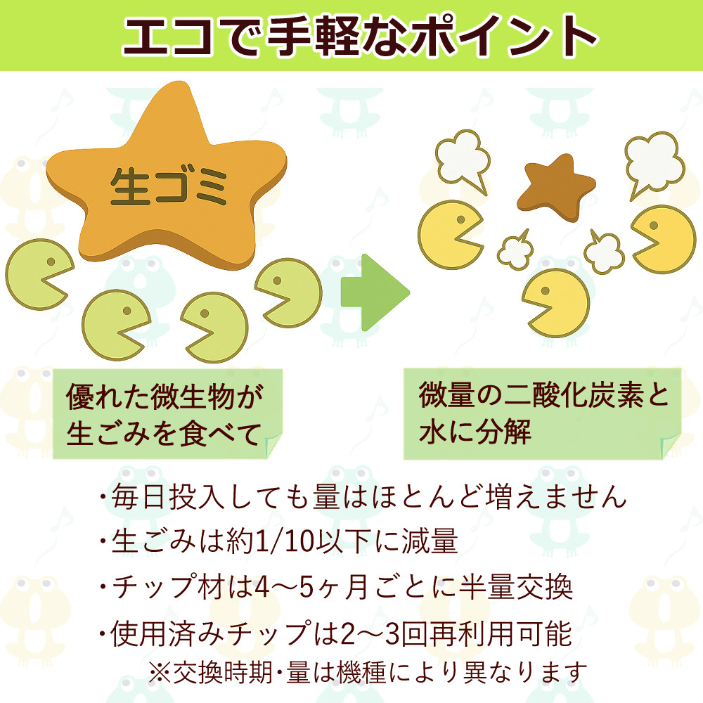 | チップ材交換の目安 | 4〜5ヶ月に一度1/2量(生ゴミの主な内容や投入量によって異なります) |