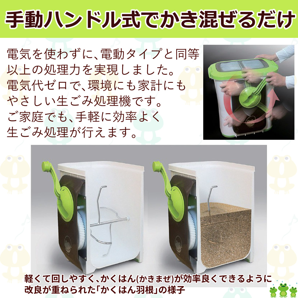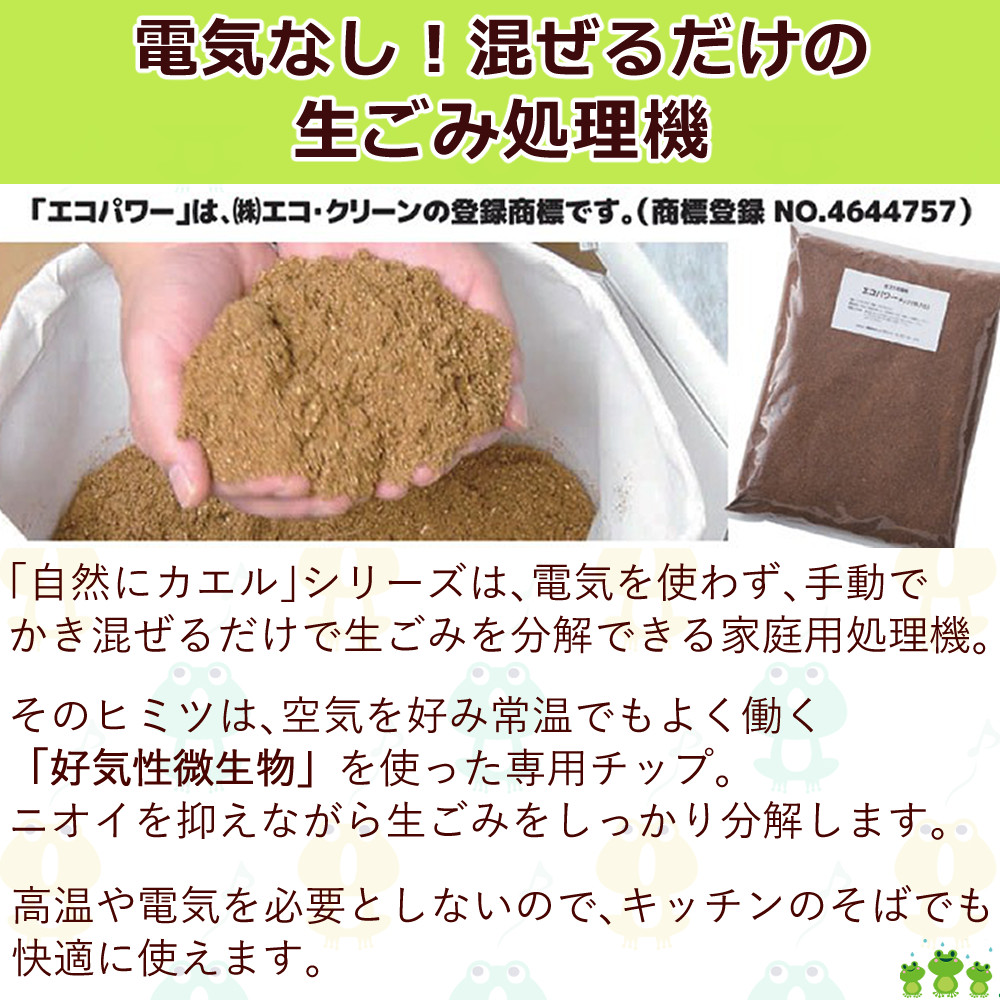 ●「自然にカエル」シリーズは、電気を使わず、手動でかき混ぜるだけで生ごみを分解できる家庭用処理機。