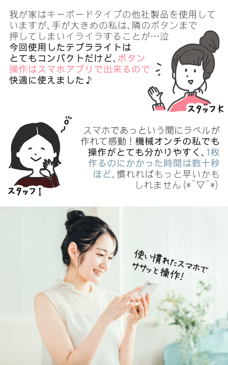 スマートフォン にBluetooth(ブルートゥース)で接続し、アプリ でつないで 簡単 に ラベル が作れます。