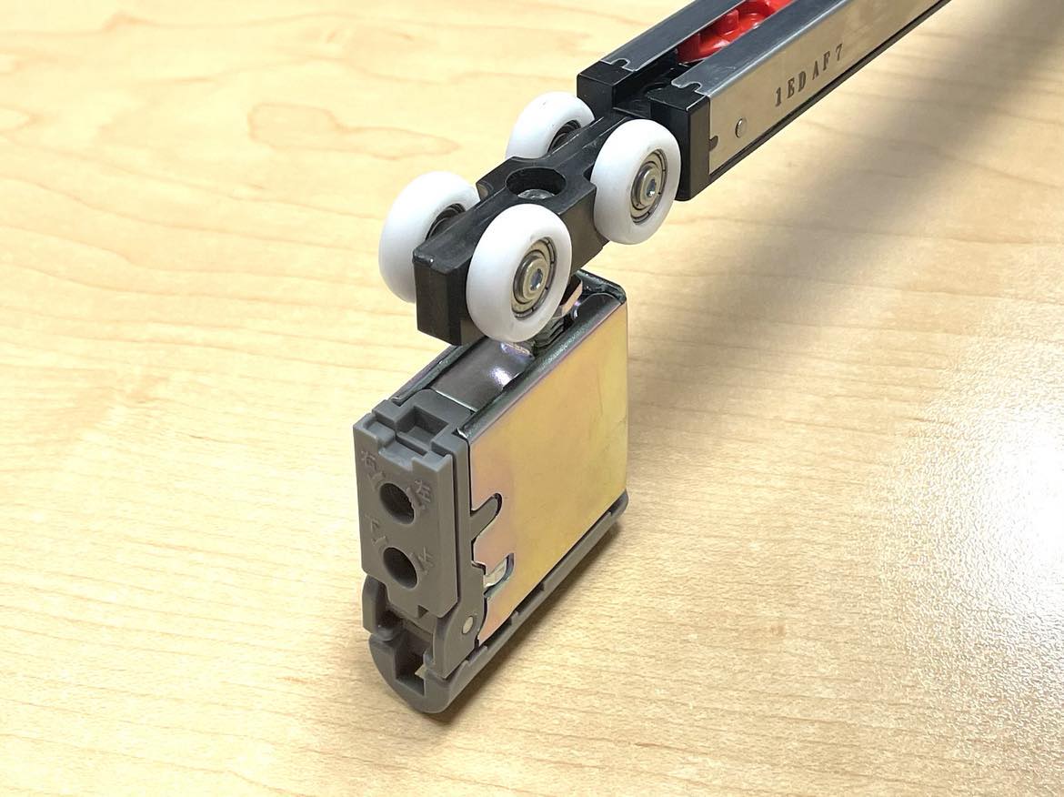 施工後のメンテナンスがしやすい、分割連結式上レールを採用したデュアルソフトクローザー仕様の引戸金物。