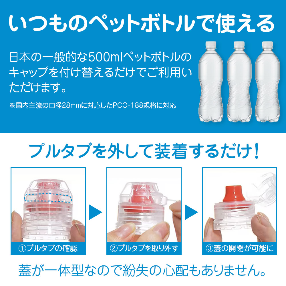 ●いつもご利用いただいている市販の500mlペットボトルに付け替えるだけでご使用いただけます。※国内主流の口径28mmに対応したPCO-188規格に対応