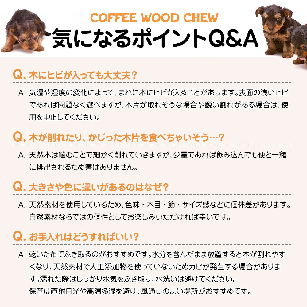 | 【天然素材で安心】 コーヒーの木を使用した犬用のおもちゃ(玩具)です。硬く繊維密度が高いため、細かく砕け、ささくれしくいため、ワンちゃんが安心して遊べます。 【噛んで歯の汚れを軽減】 遊びながら木の繊維質を噛むことで汚れをからめとり、歯の汚れを軽減。 【ダイエットなどの体重管理にも】 Noカロリー、Noカフェイン、添加物不使用、カロリーが含まれるガムやおやつの代わりに、体重管理が必要なワンちゃんにも安心してご利用いただけます。 【ストレス軽減】 木の棒を噛んで遊ぶことで愛犬のストレス解消になり健康管理にも役立ちます。 |