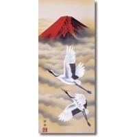 霊験あらたかに真紅に染まる赤富士を背に、仲睦まじく優雅に飛翔する夫婦鶴。黄金の雲海がたなびき、まさに吉祥慶賀の詩を高らかに謳い上げる逸品です。
