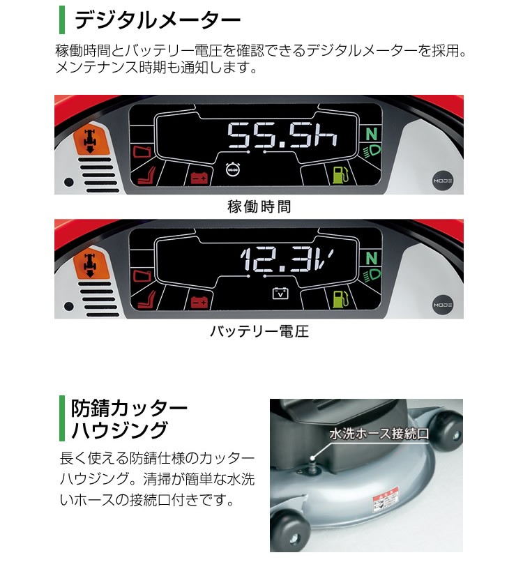 コントロールパネルは「稼働時間」や「バッテリー電圧」などを確認できる液晶のデジタルメーターを採用。着座位置からの視認性に配慮するだけでなく、メンテナンスタイミングの通知機能により、適切な機材の管理をサポートします。