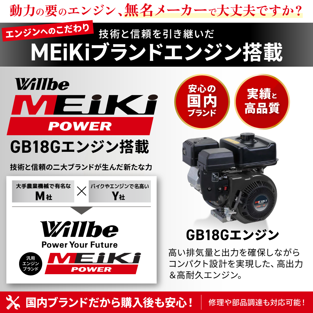 動力の要であるエンジンには、技術と信頼を継承した国内ブランド「Willbe MEiKi POWER」 GB18Gエンジンを採用。 操作パネルの集約により、操作性を飛躍的に向上。優れた始動性と安定駆動で作業をサポートします。 国内ブランドならではの、購入後の修理や部品調達といった万全のアフターフォロで、長く、安心して使い続けられます。