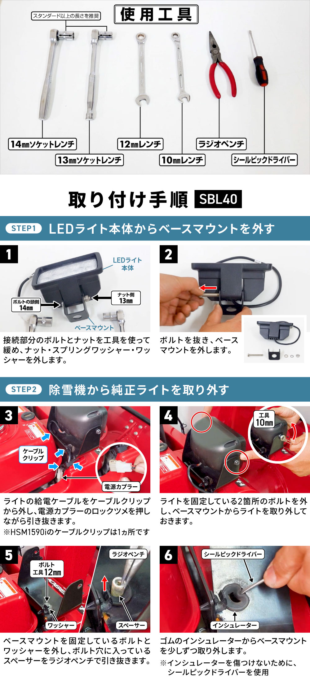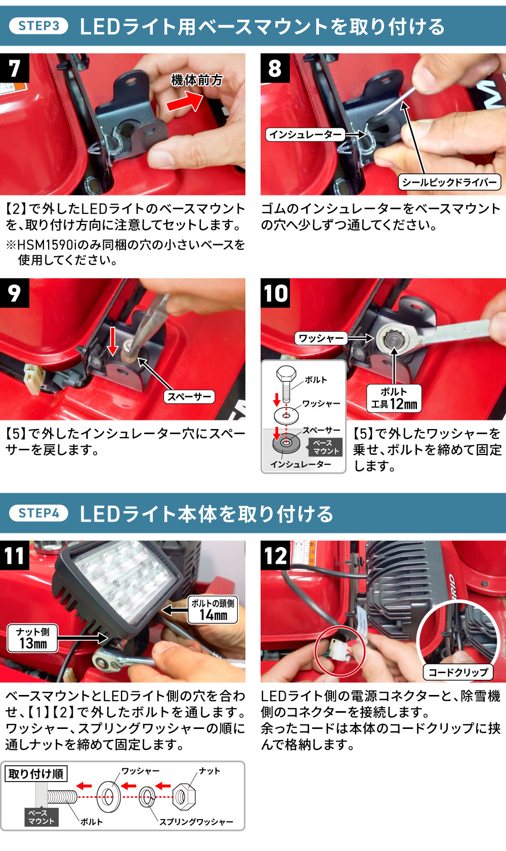 除雪機ライト交換時、取付箇所のゴム部品が劣化・硬化していると、ライトの脱落や故障の原因となります。モデルに合った交換用ゴム部品をあわせてお買い求めください。
