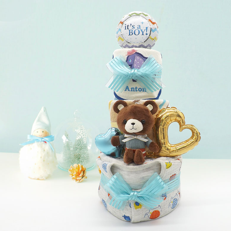 おむつケーキ 男の子 ベビー服つき 3段 くまのマスコット ニックナックのスタイ 出産祝い【送料無料】