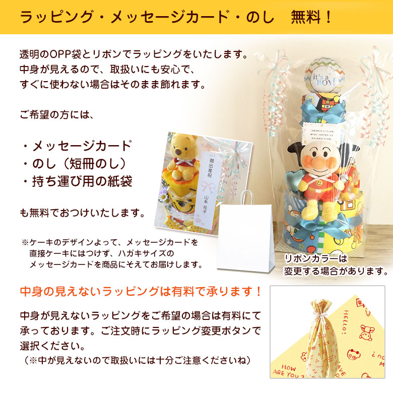 おむつケーキは透明のOPP袋とリボンでラッピングをしています。