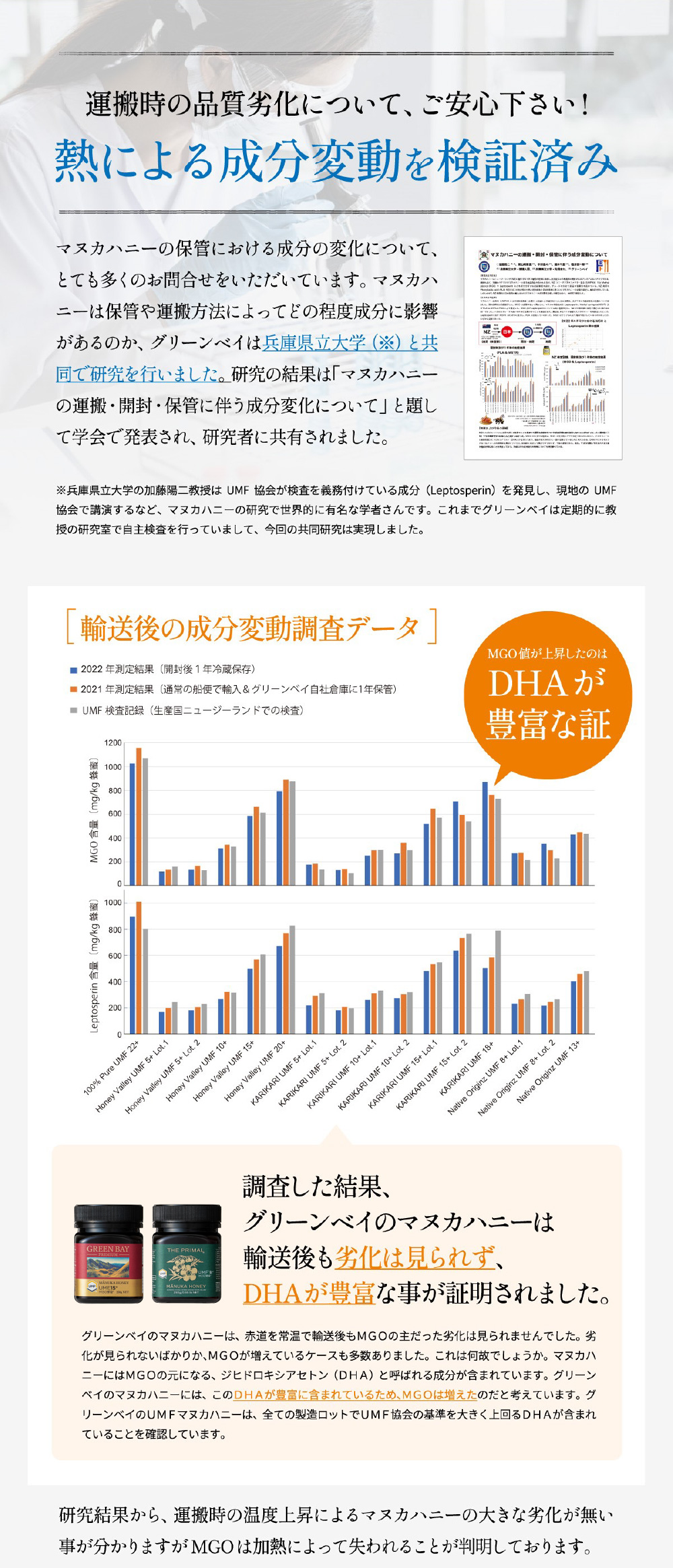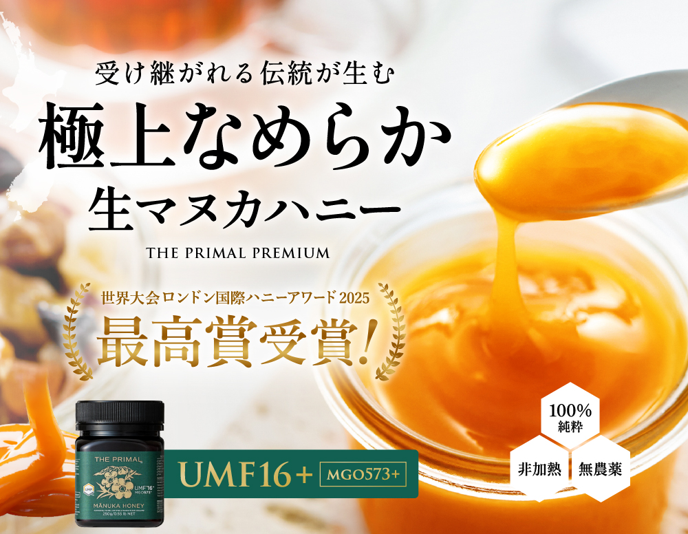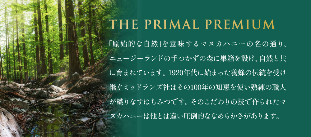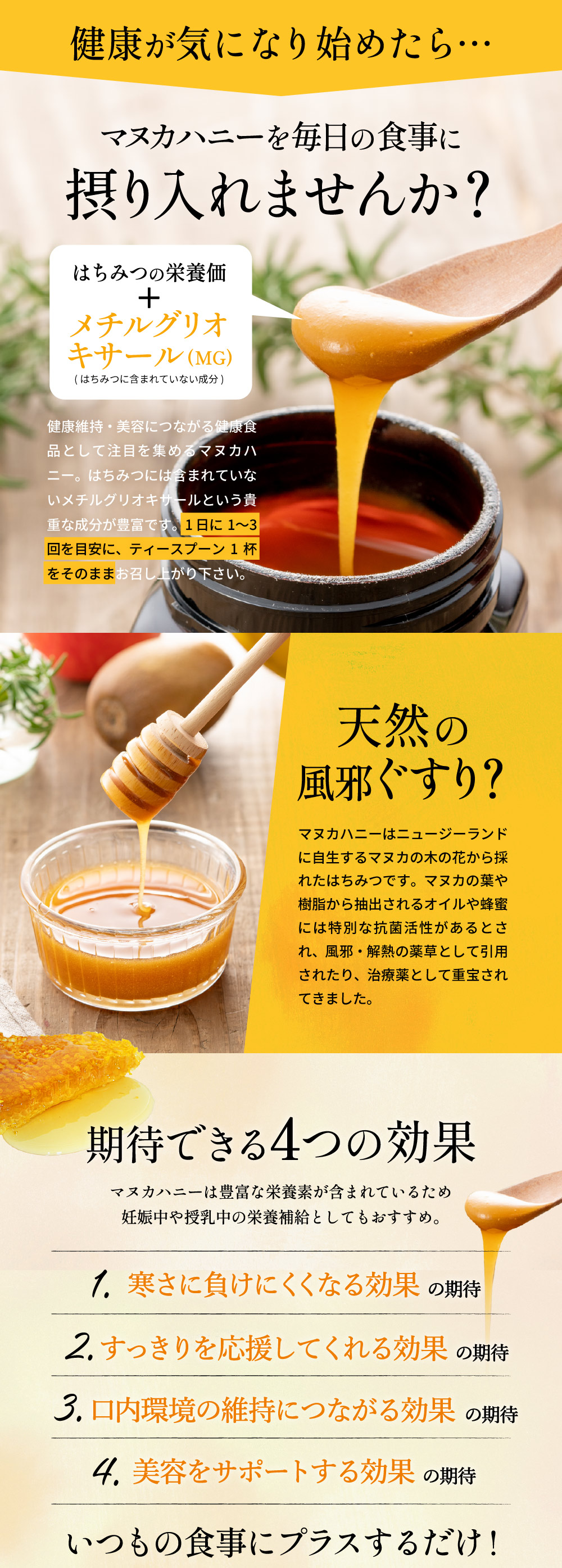 ニュージーランドに自生するマヌカの木の花から採れたはちみつです。その効能は未だ研究段階ではありますが様々な論文が発表されており、マヌカハニーのなかに含まれるメチルグリオキサール(MGO)・レプトスペリンという成分が多くの学者さんから注目されています。