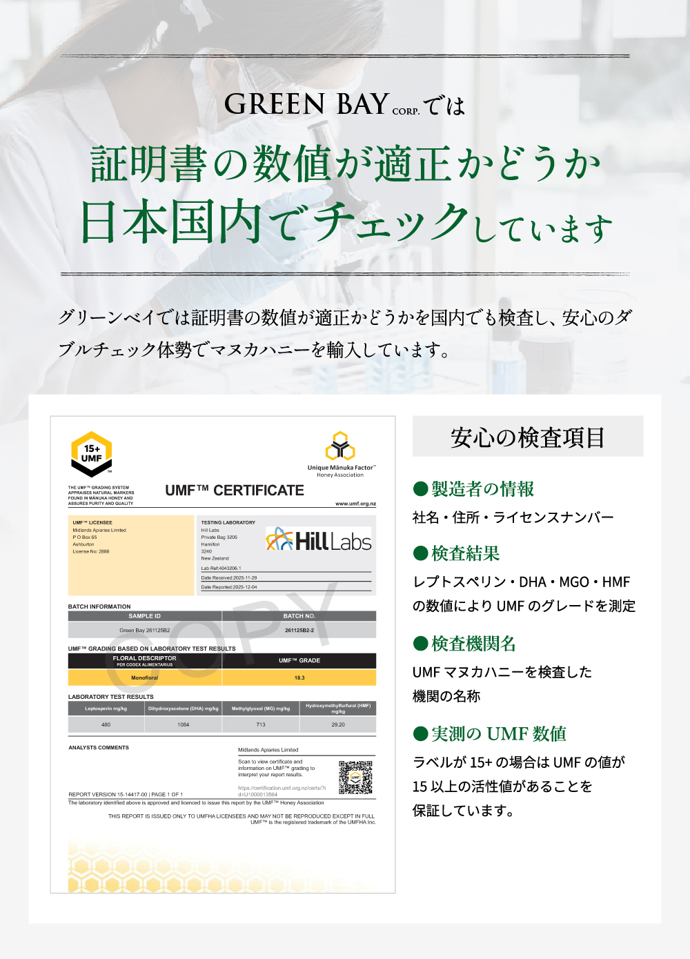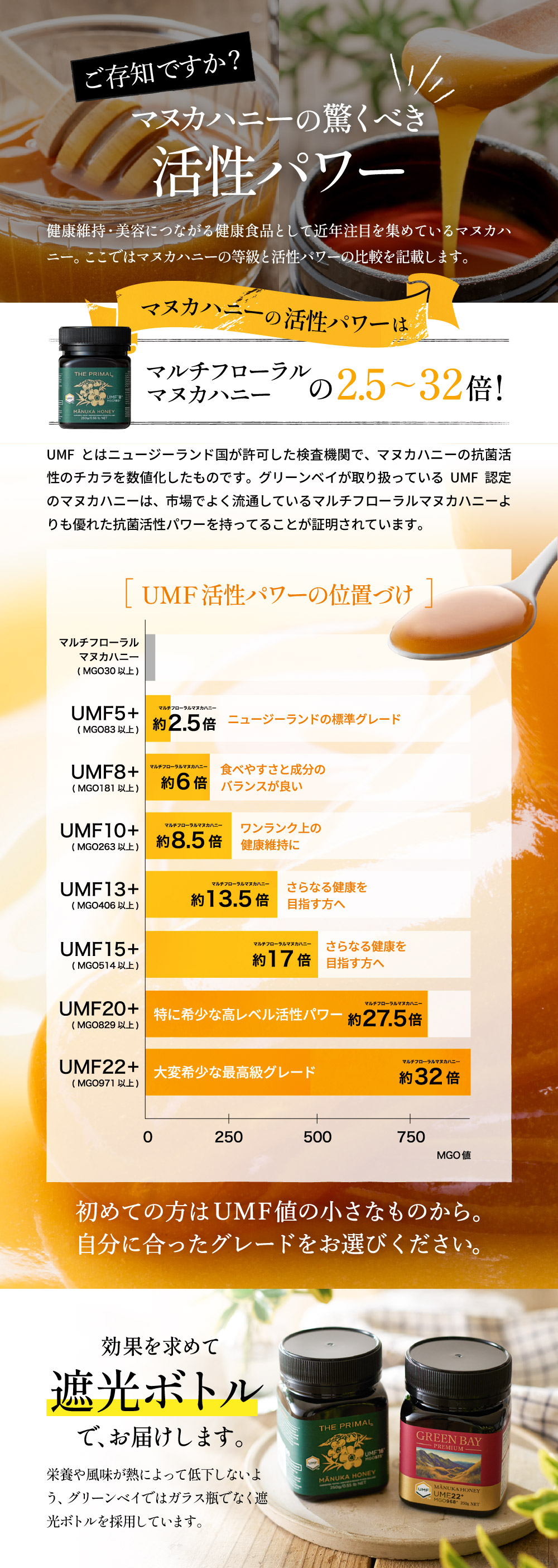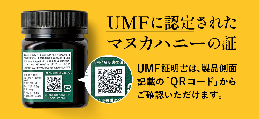 UMF・MGS・MGOなどの規格がありますが、これらは全てメチルグリオキサール(MGO)の量を計測しています。MGOの量とUMF・MGSの値は相関性があることが分かっていますので、MGOの値が高ければUMF・MGSの値は高くなります。UMF値からMGO値への換算は、こちらのページ上部をご確認ください。