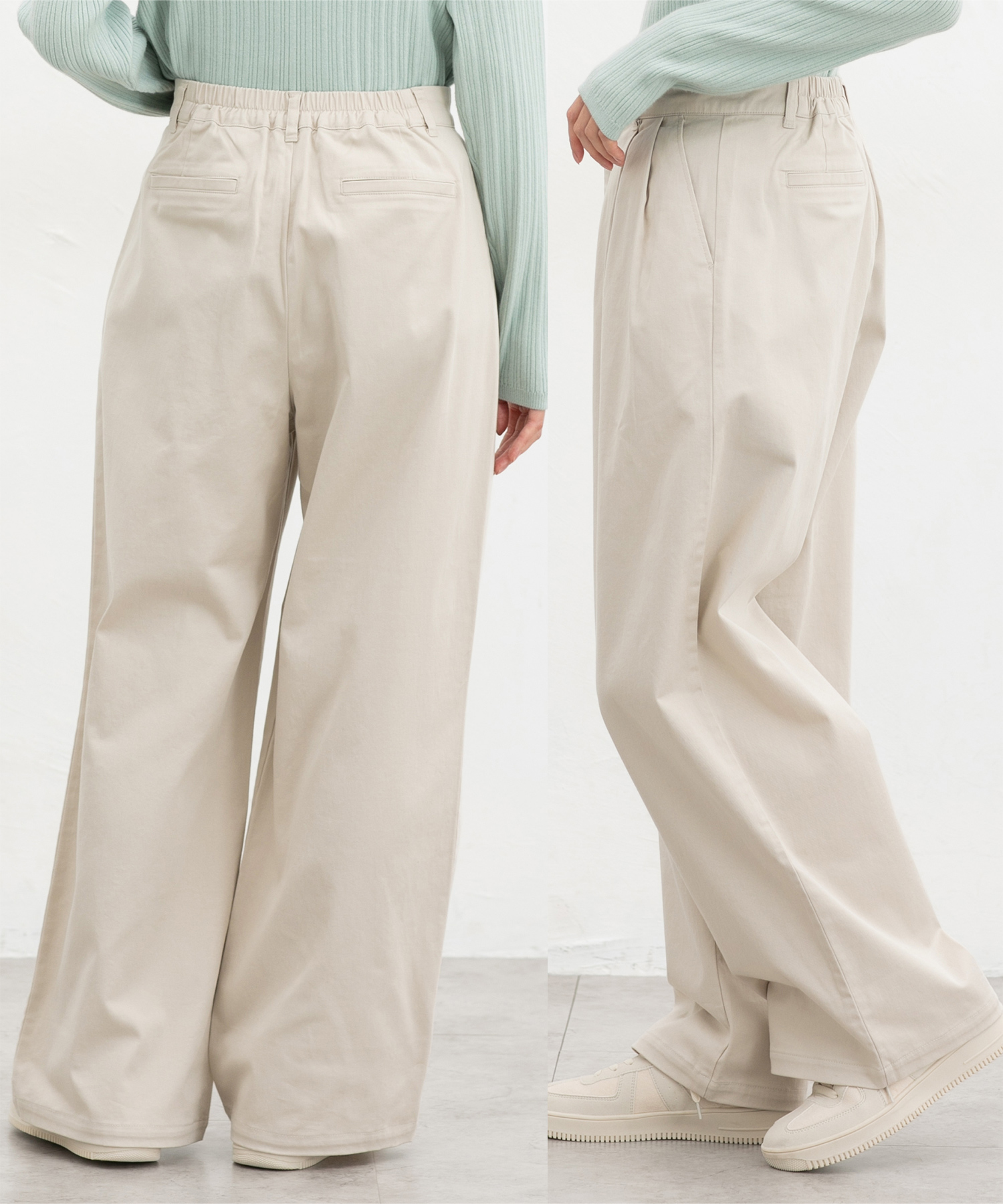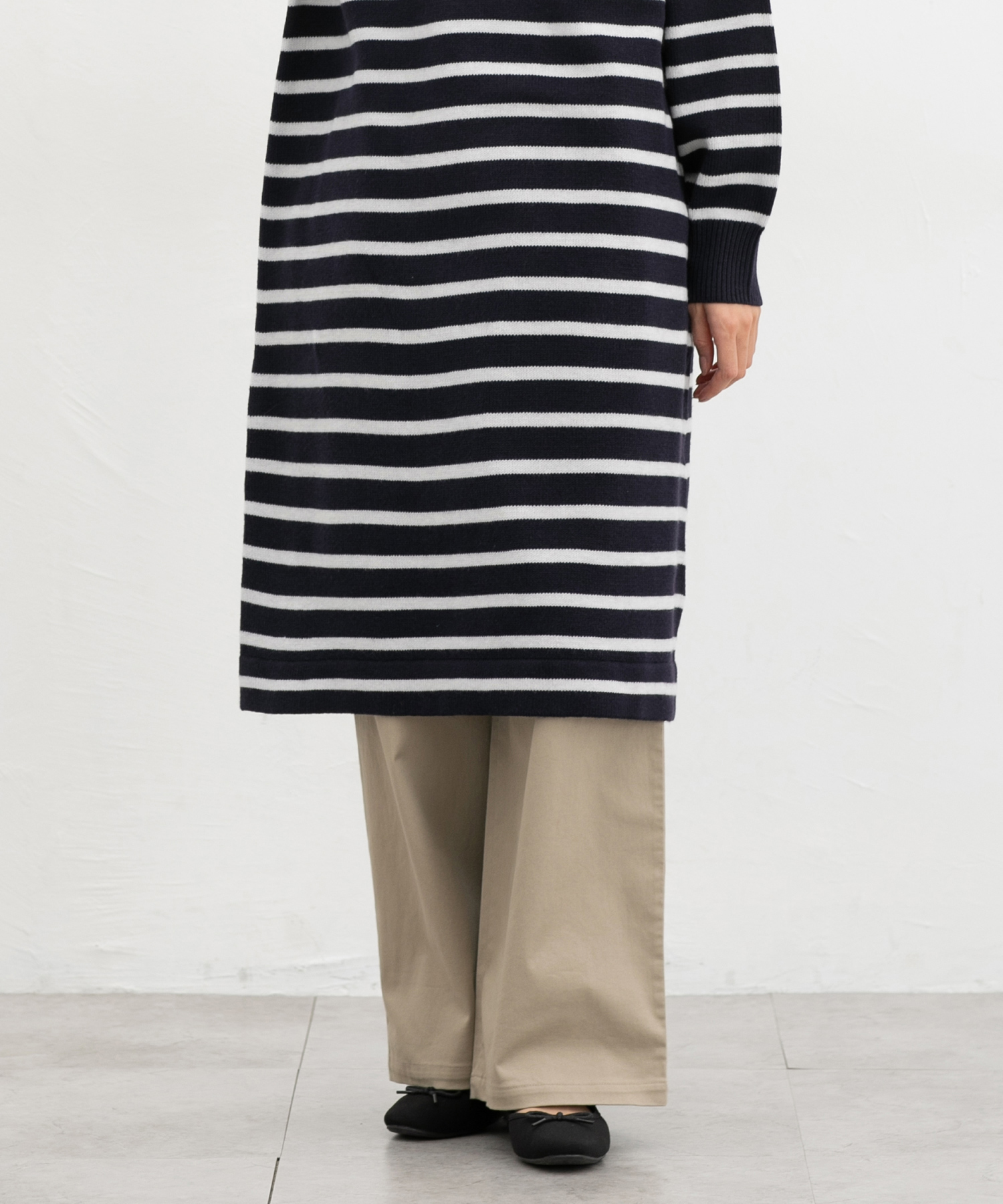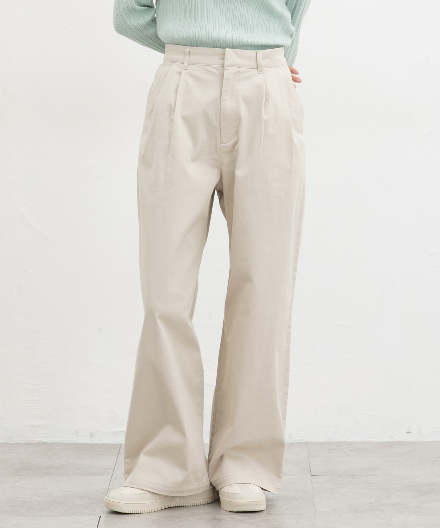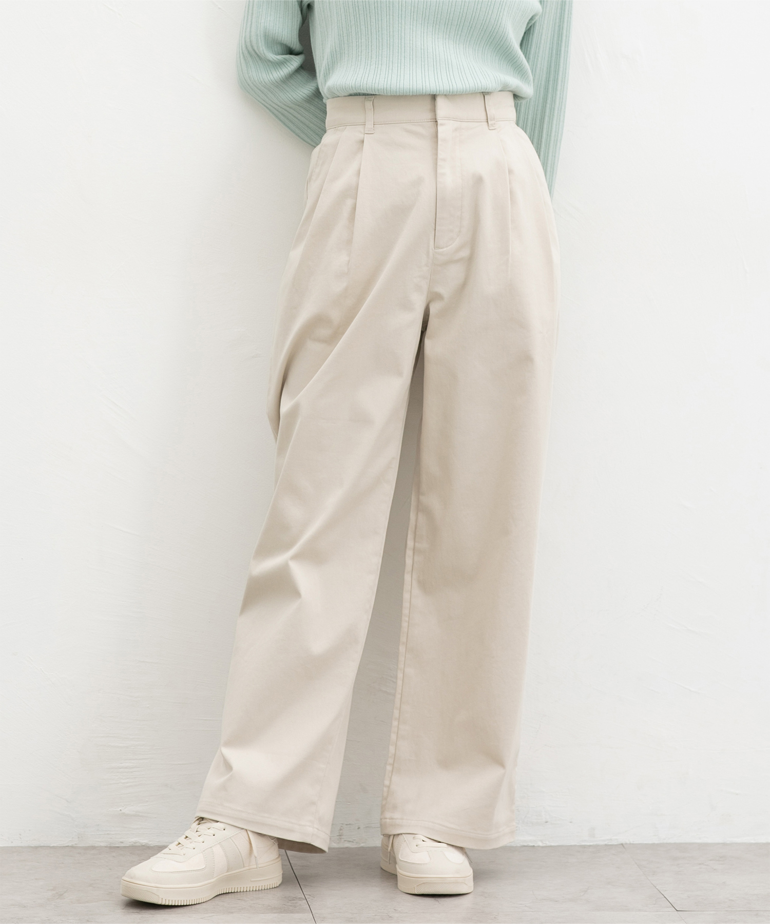 広がりすぎないワイドシルエットのチノストレート、股下69cmタイプ。