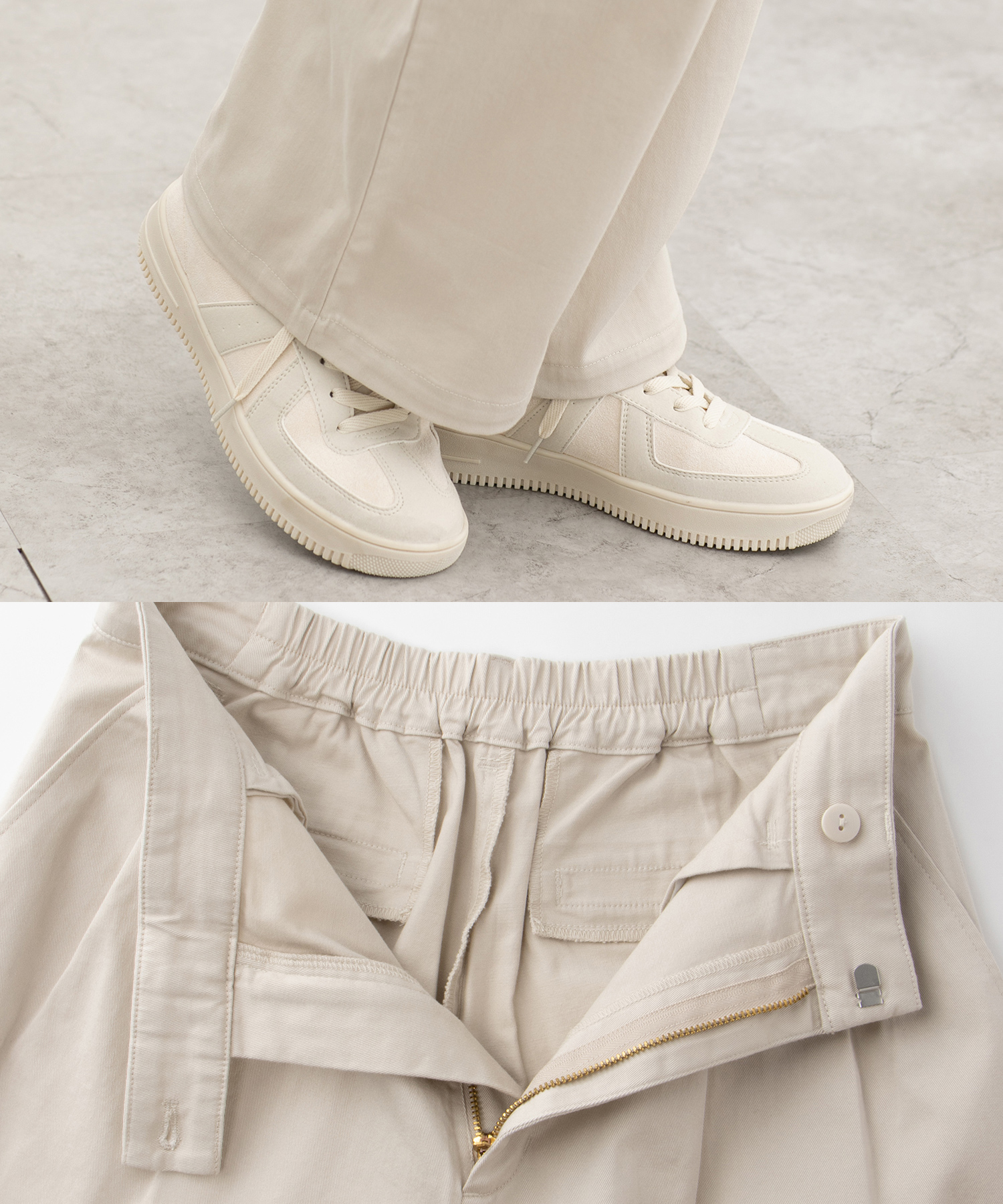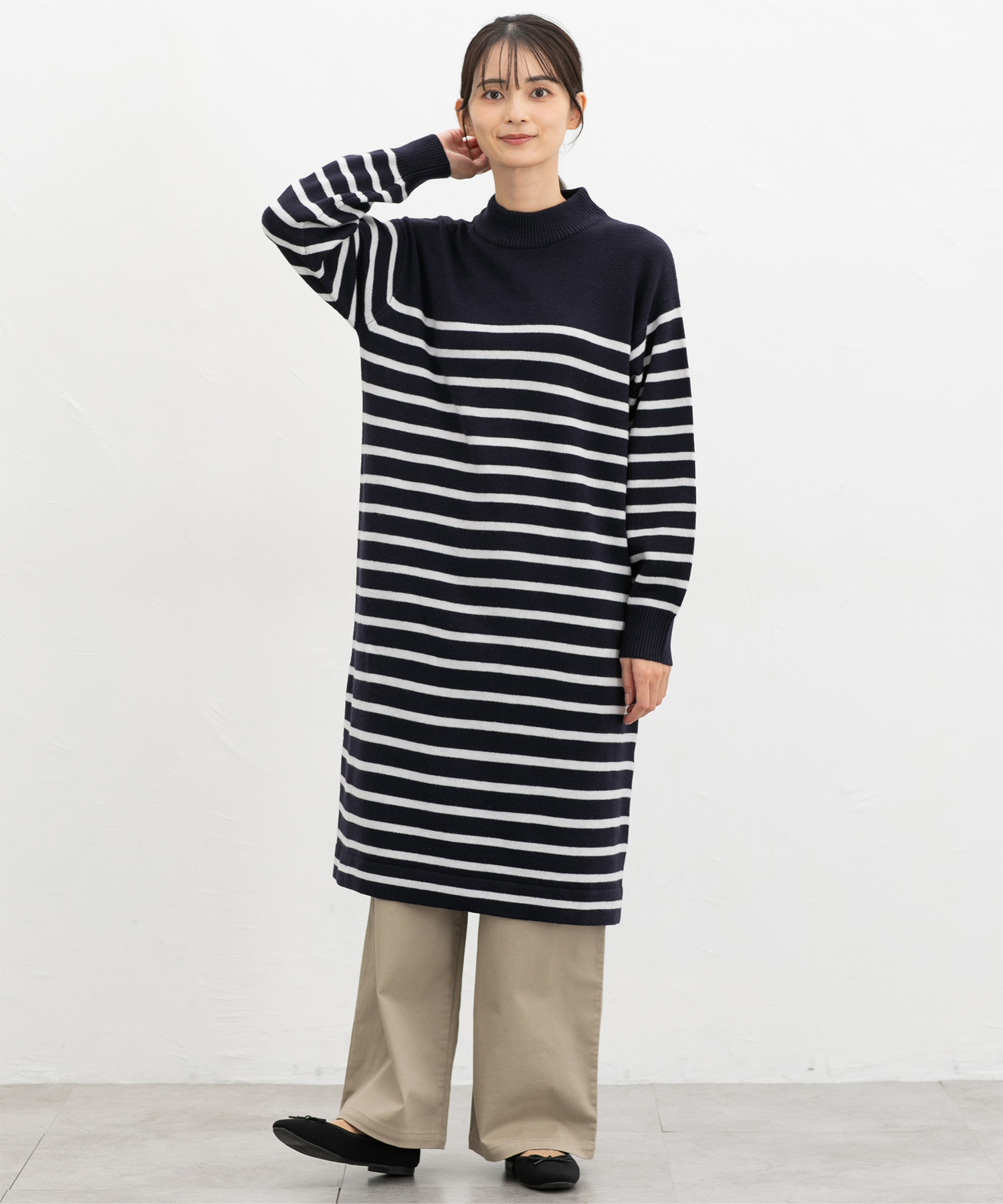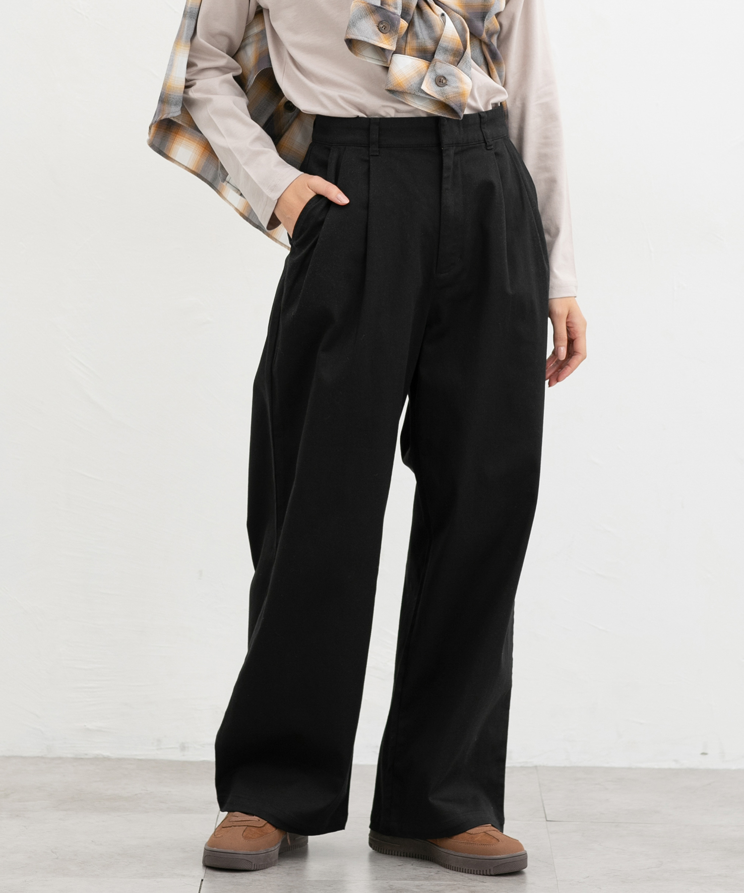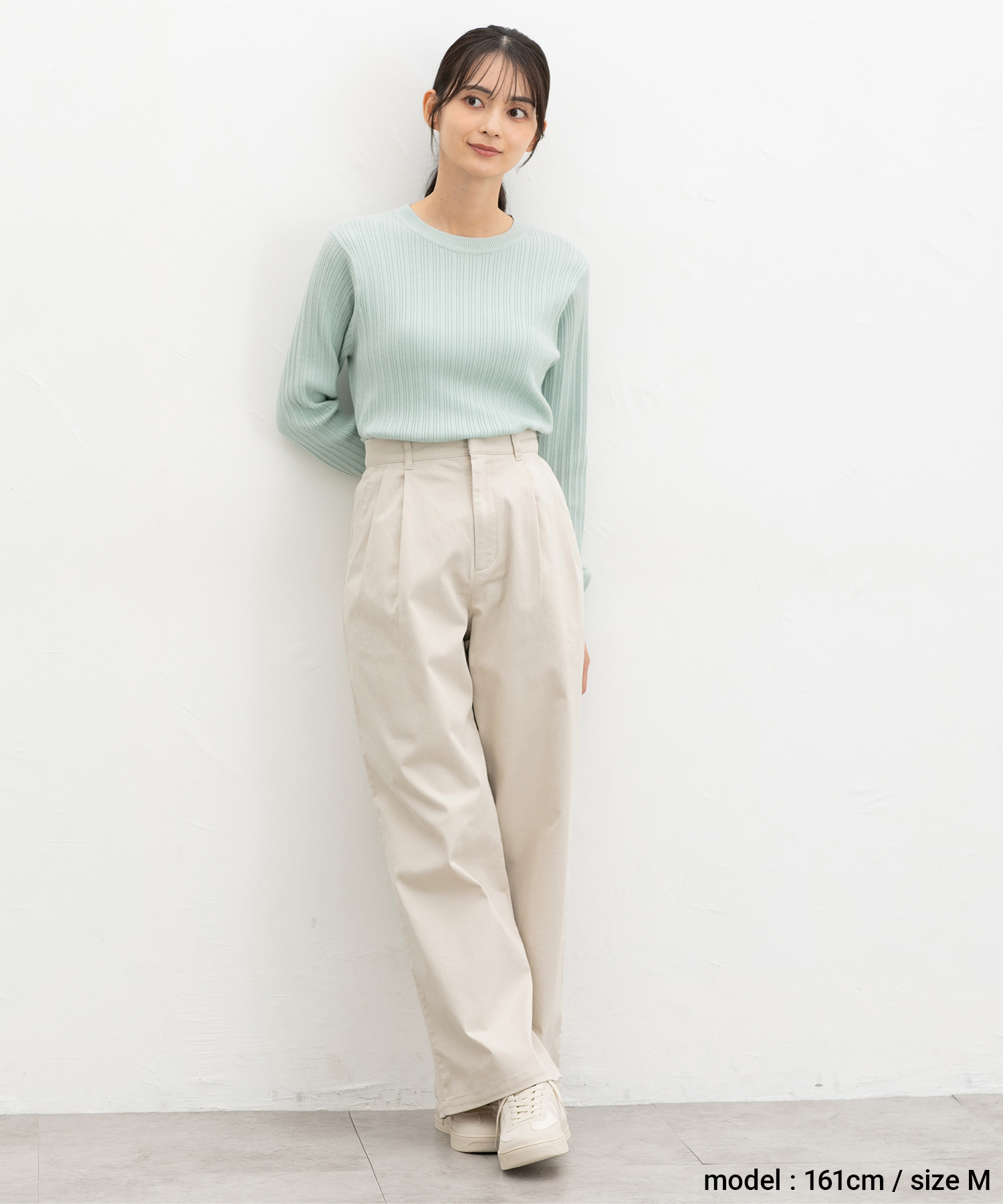 広がりすぎないワイドシルエットのチノストレート、股下69cmタイプ。