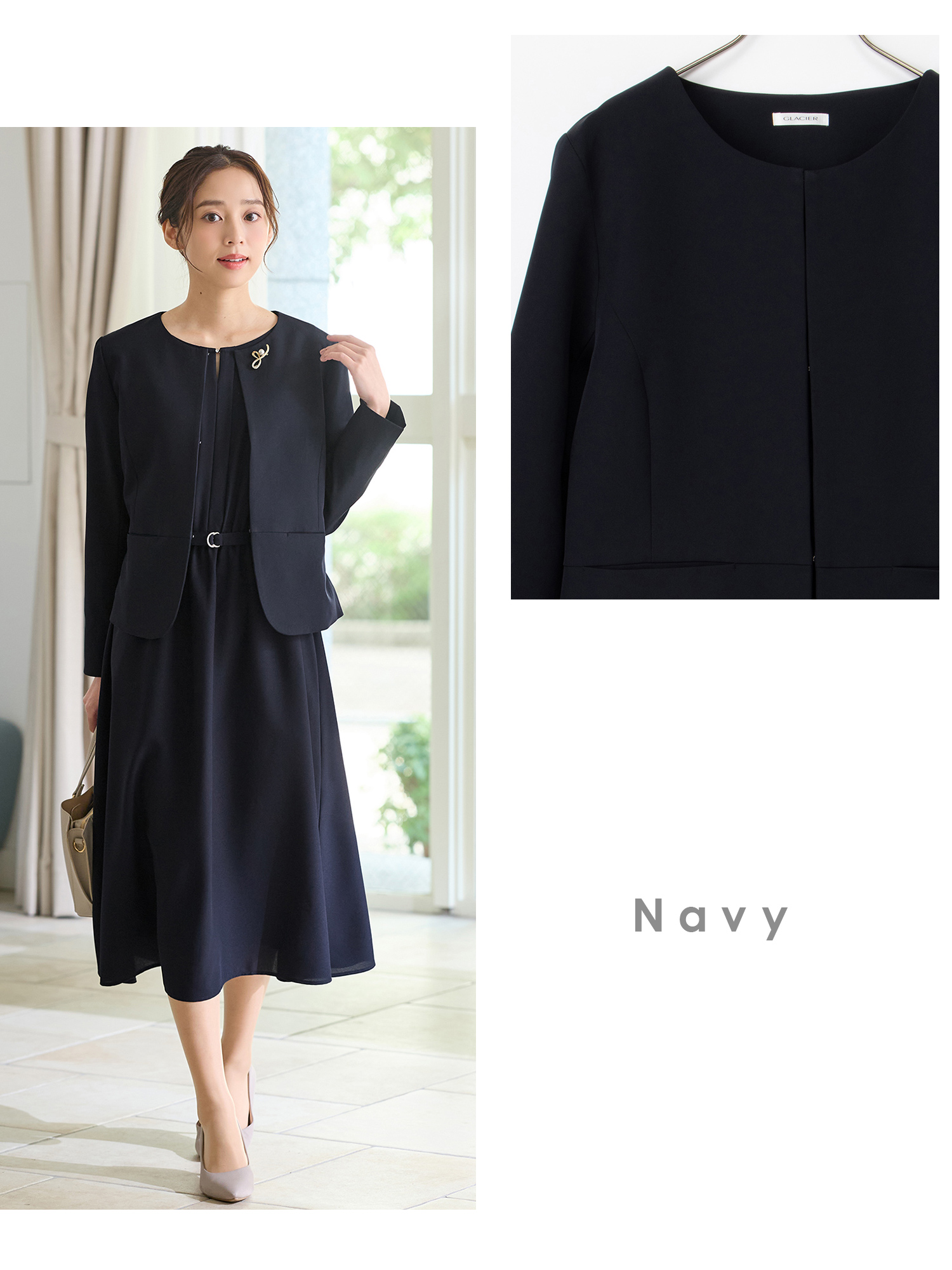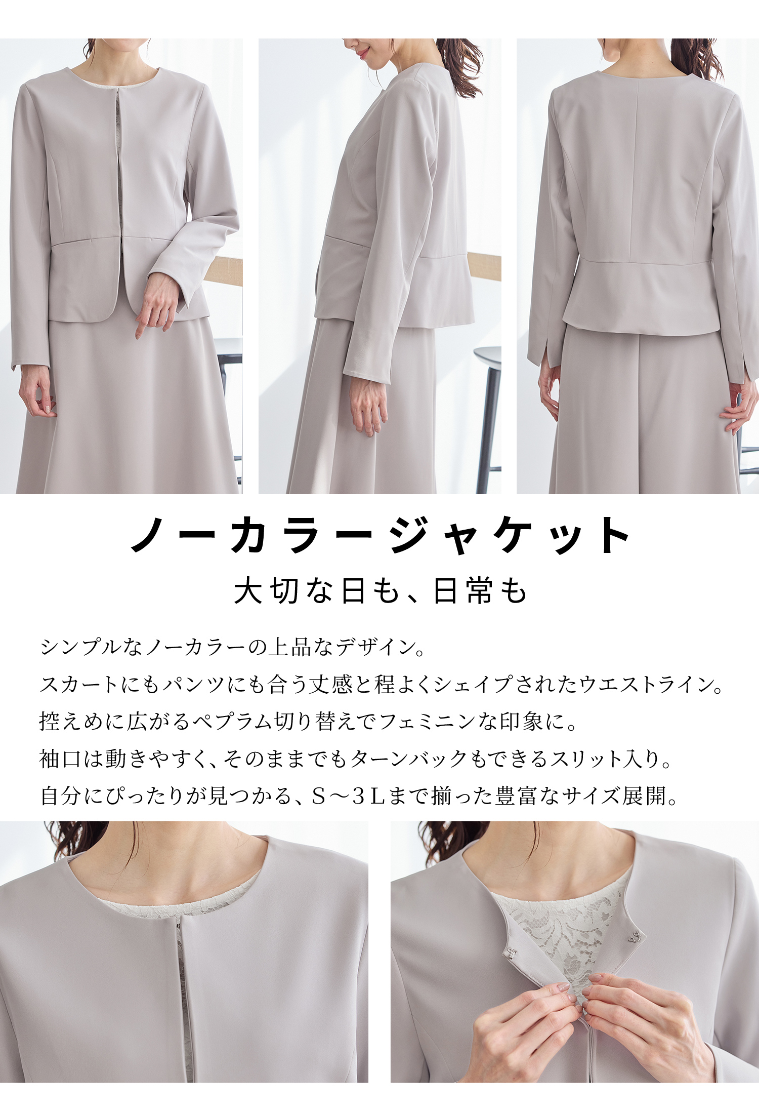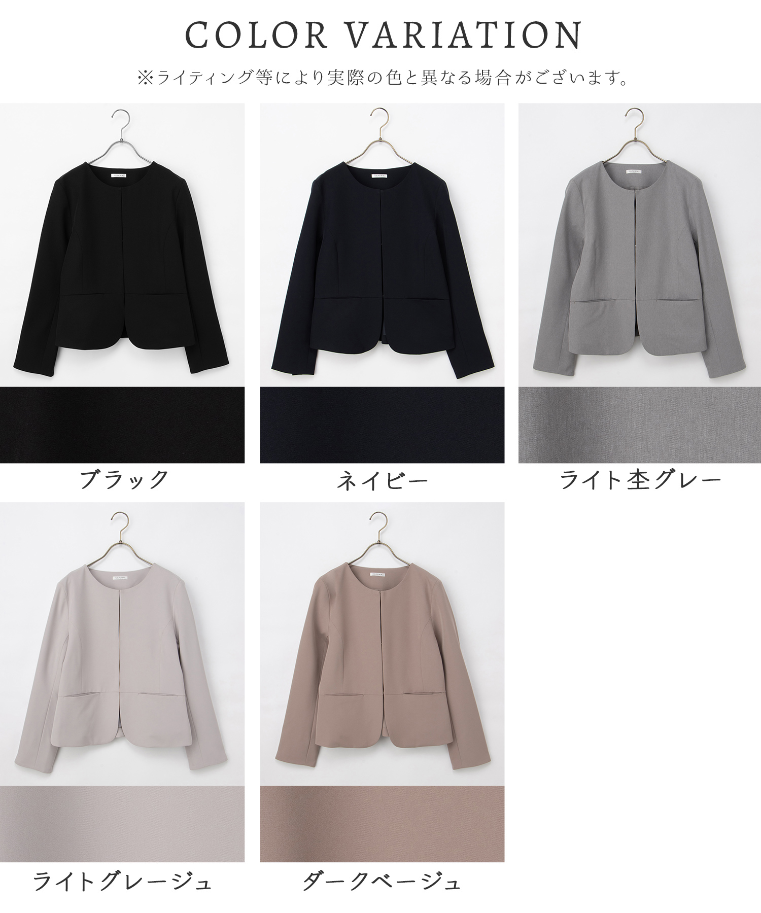 シンプルなノーカラーの上品なデザイン。