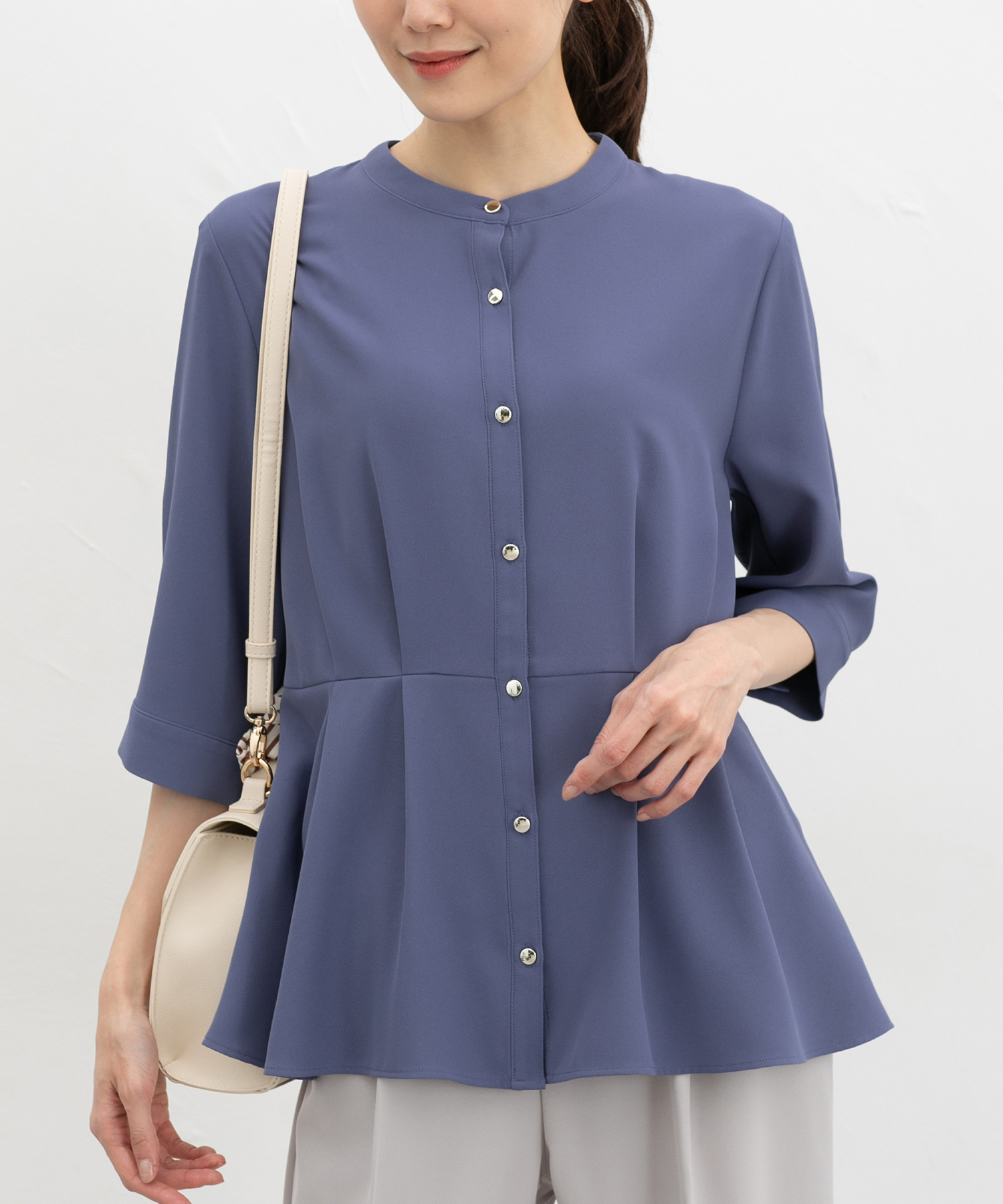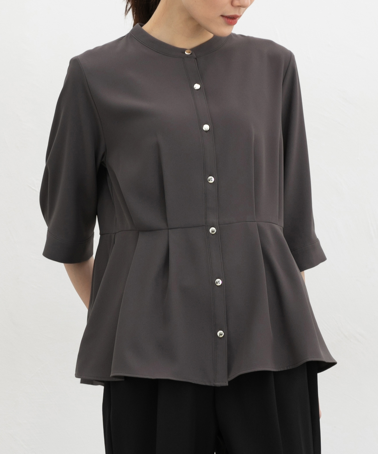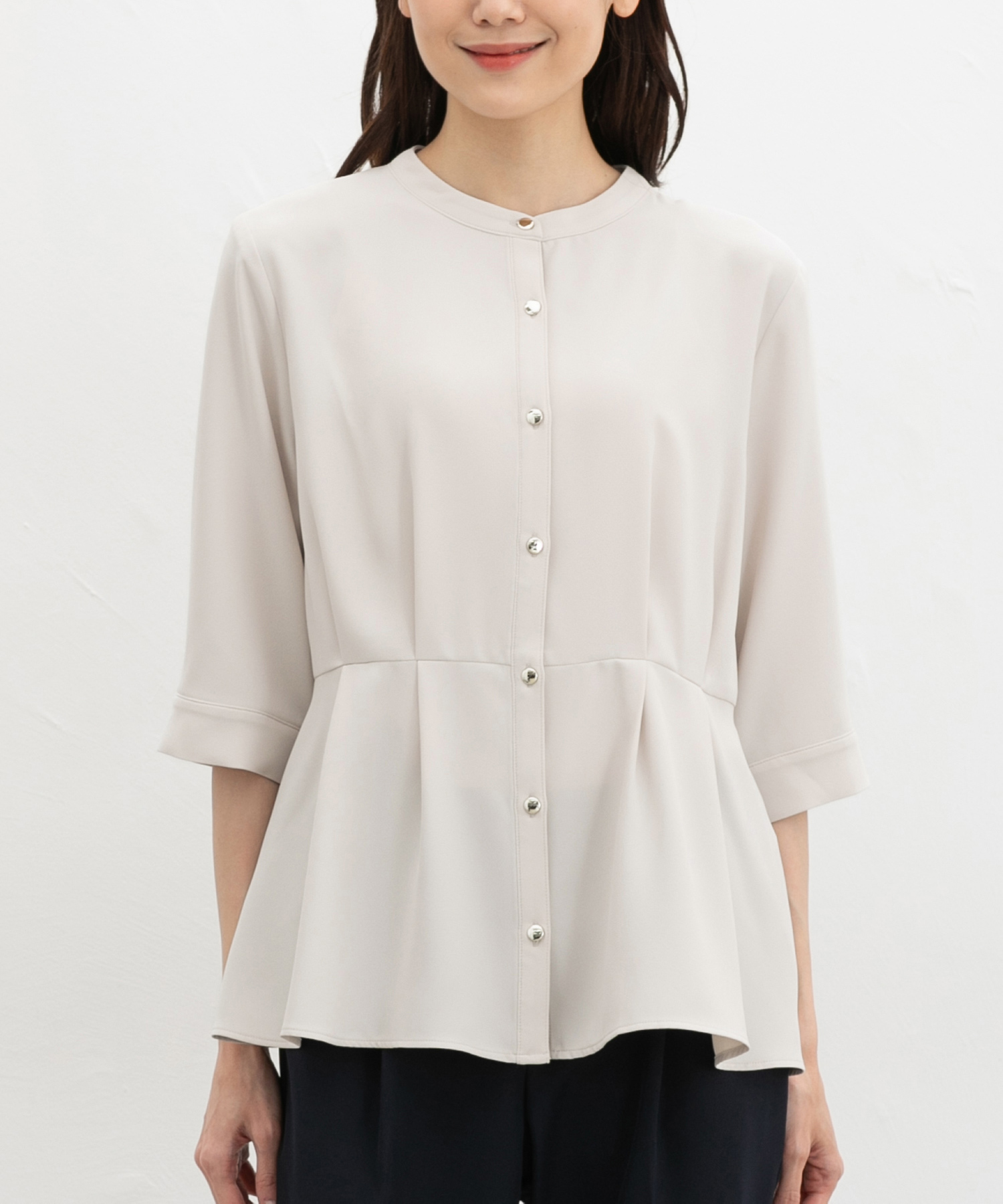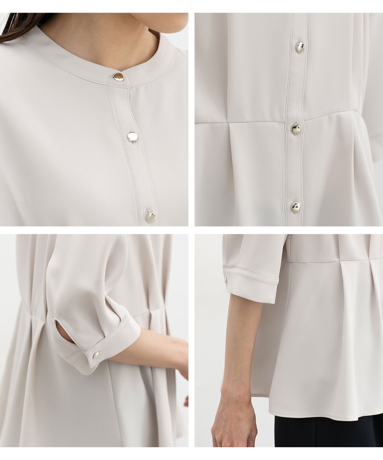 優しい印象のバンドカラーデザインにゴールドボタンでさりげない華やかさをプラス。