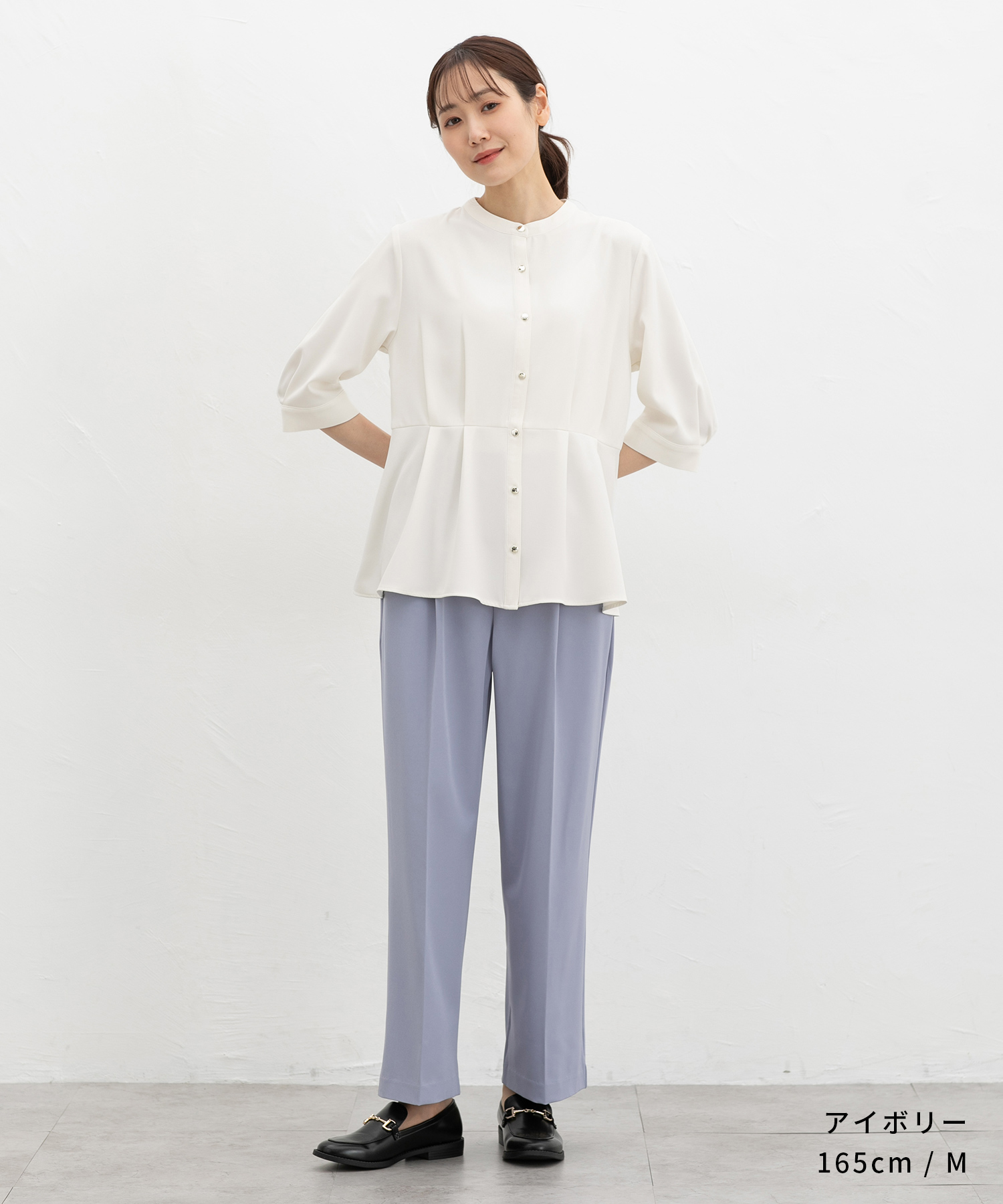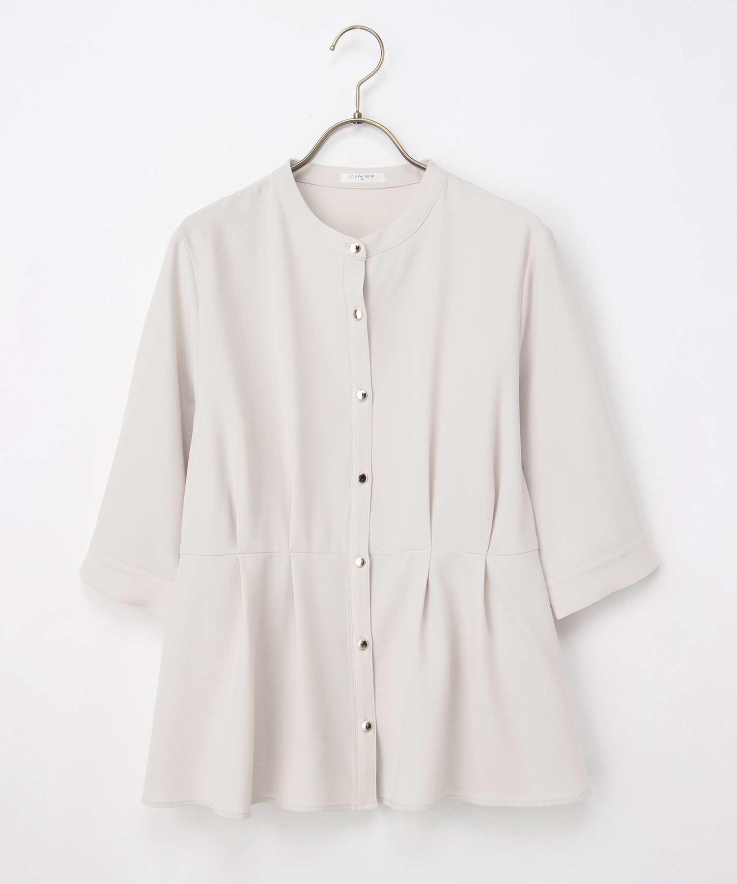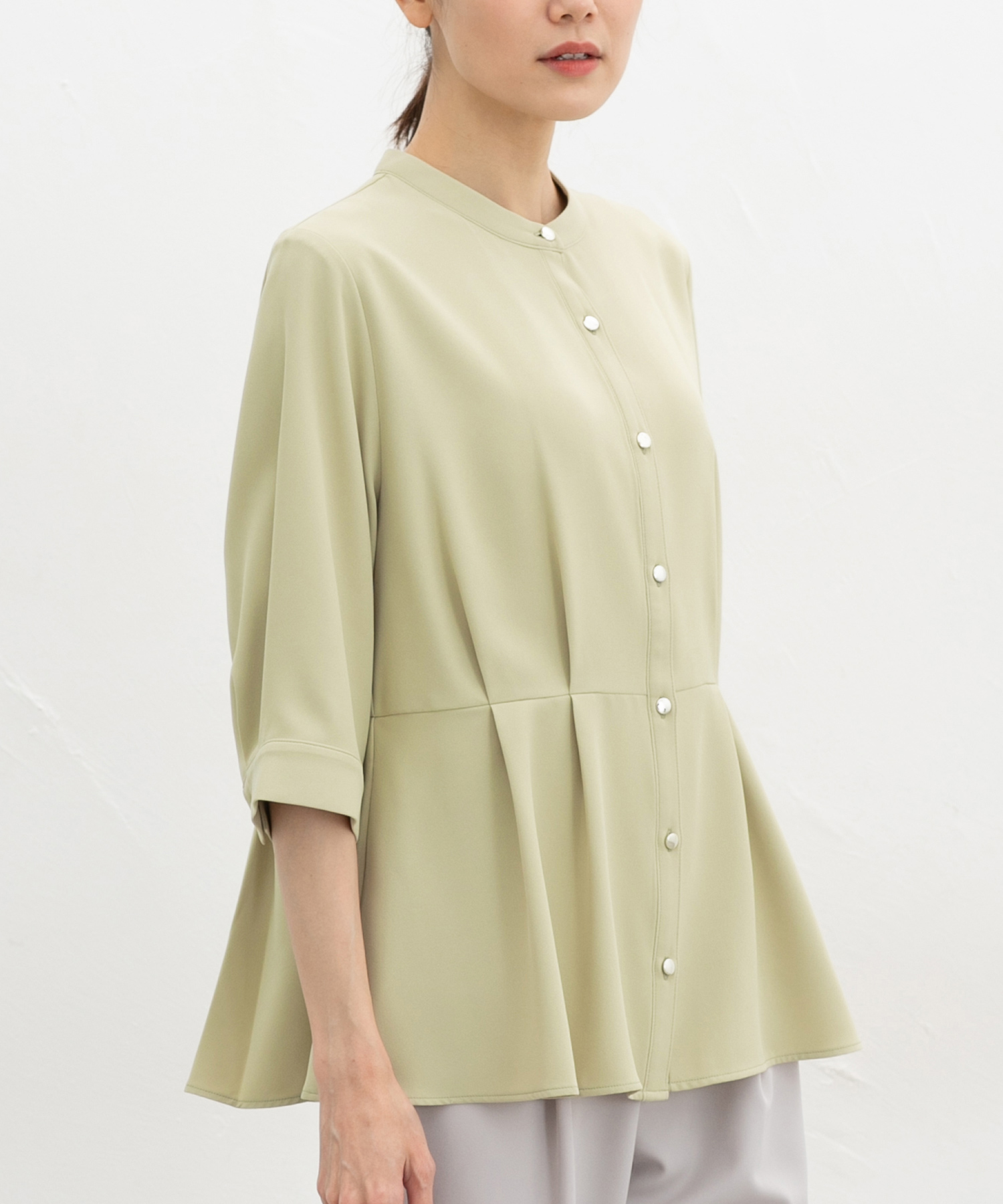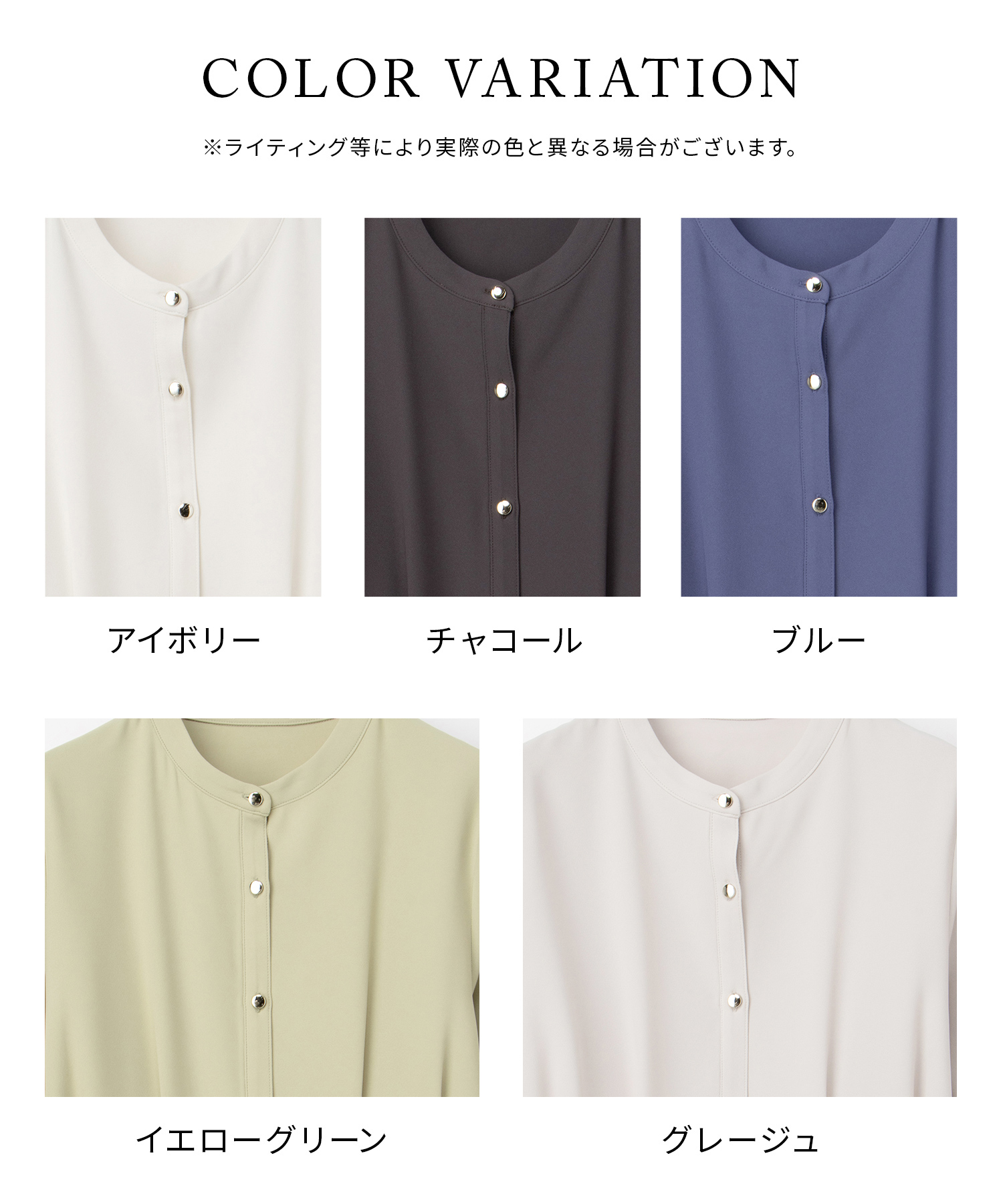 優しい印象のバンドカラーデザインにゴールドボタンでさりげない華やかさをプラス。