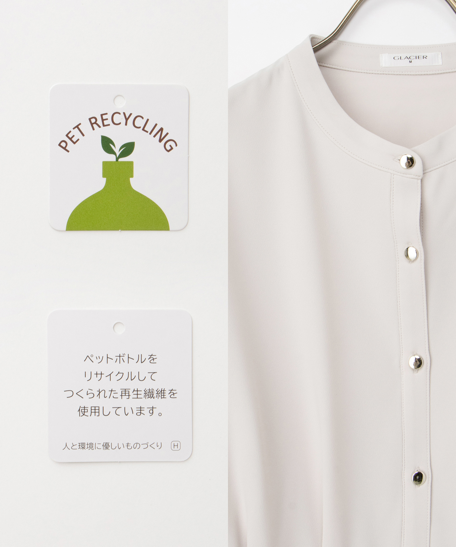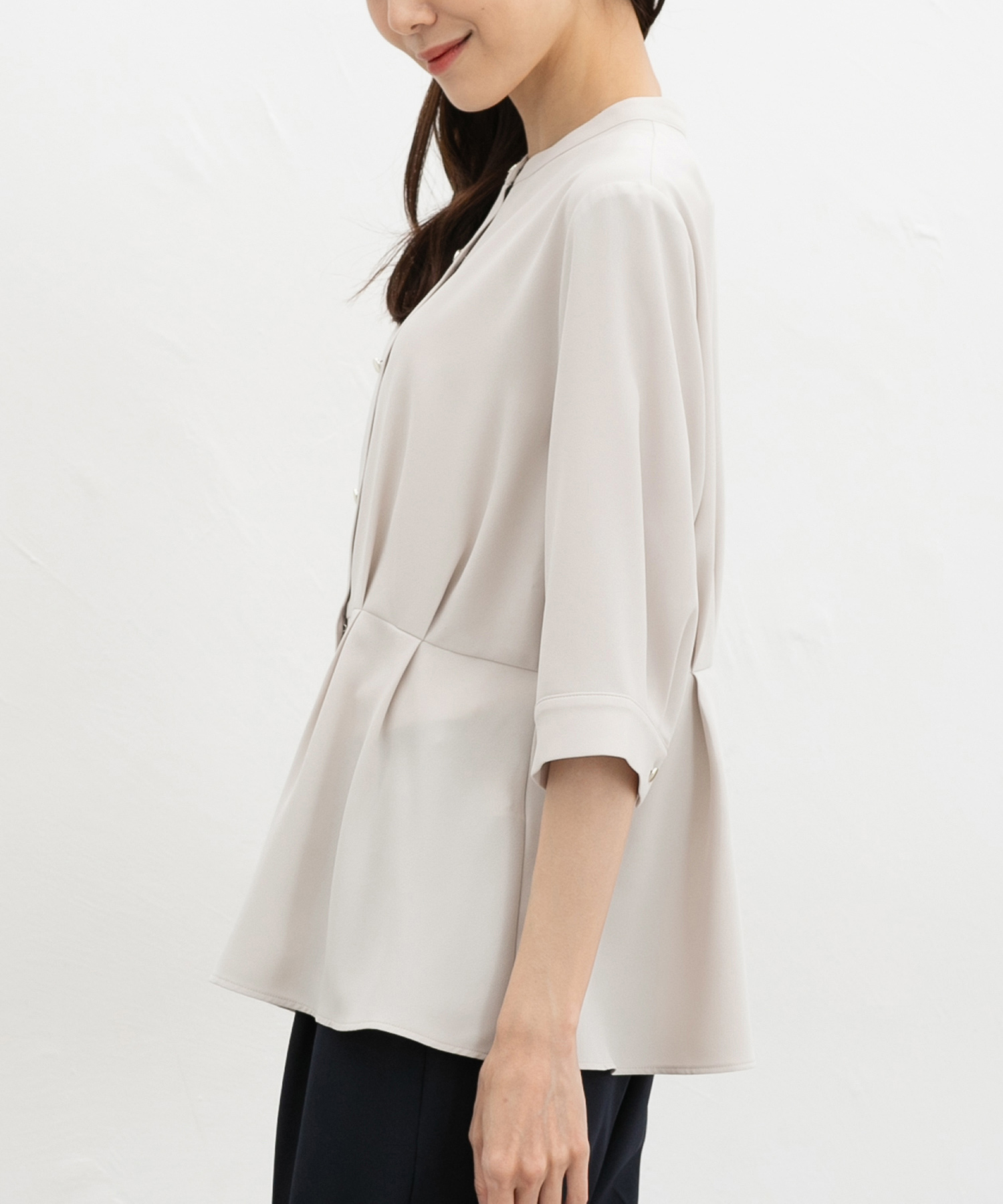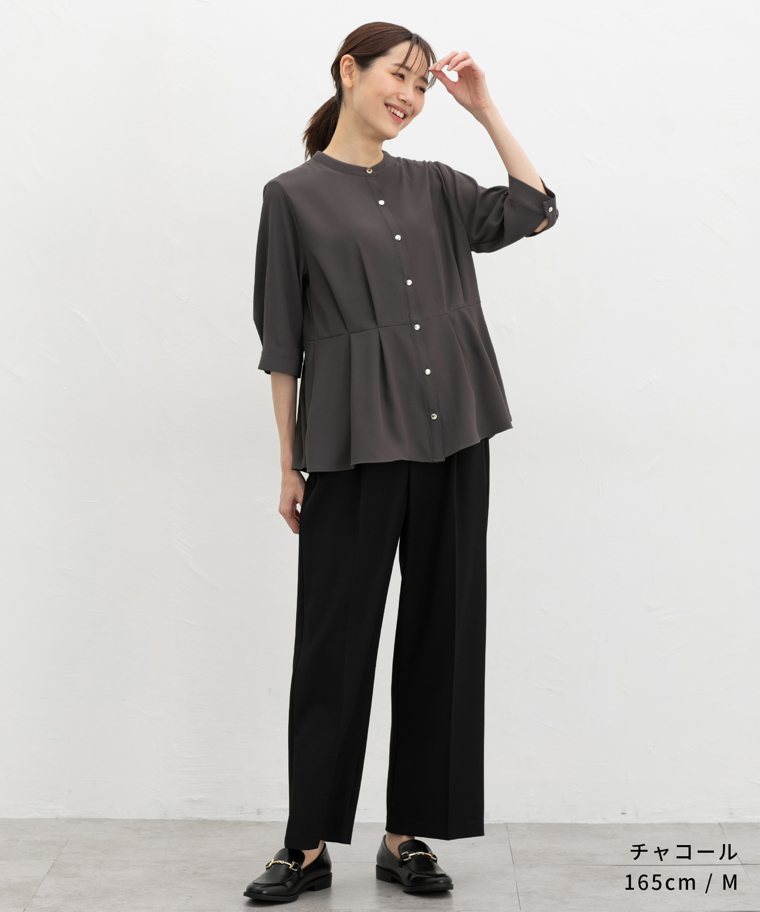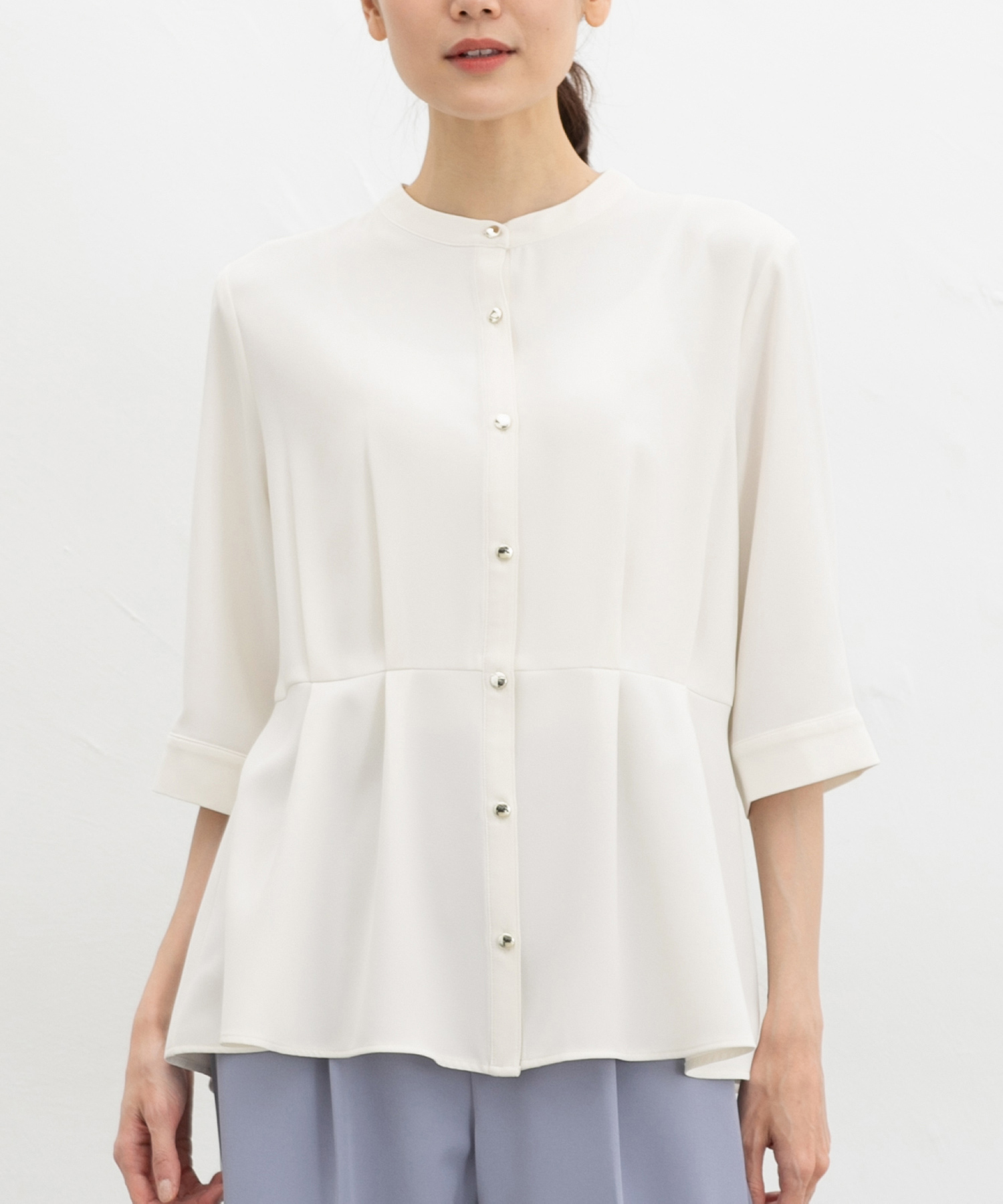 優しい印象のバンドカラーデザインにゴールドボタンでさりげない華やかさをプラス。