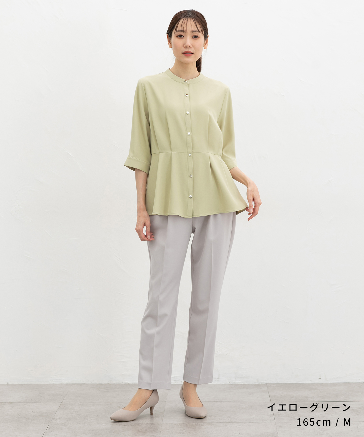 商品カテゴリ:6730630171 トップス ブラウス 大きいサイズ オフィス きれいめ ウエストタック 再生ポリエステル ジョーゼット素材 バンドカラー フロントボタン フェミニン 夏 白 カテゴリ105007 tops 7分袖 7部袖 7分丈 七分袖 8分袖 8部袖 8分丈 八分袖 9分袖 9部袖 9分丈 九分袖 半端袖 XLサイズ 3Lサイズ XL 3L FP502 おしゃれ オフィスカジュアル 通勤 通勤スタイル 通勤服 大人女子 きれいめカジュアル きちんと服 オフィス服 会社 オフィススタイル かっちり 清潔感 コンサバ 上品 大人 20代 30代 40代 アラサー OL トレンド 流行 リサイクル 再生ポリ 環境保護 サスティナブル サステナブル エコ ジョーゼット 前ボタン 前開き 前釦 ボタン ゴールドボタン 可愛い 清楚 大人可愛い タグ再生ポリエステル Sサイズ S 小さいサイズ Mサイズ Lサイズ LLサイズ LL シーズン夏 夏物 夏服 夏秋 初秋 秋 秋物 秋服 新作 新着 アイボリー ホワイト チャコール グレー 灰色 ブルー 青 グリーン 緑 みどり イエロー 黄色 イエローグリーン グレージュ